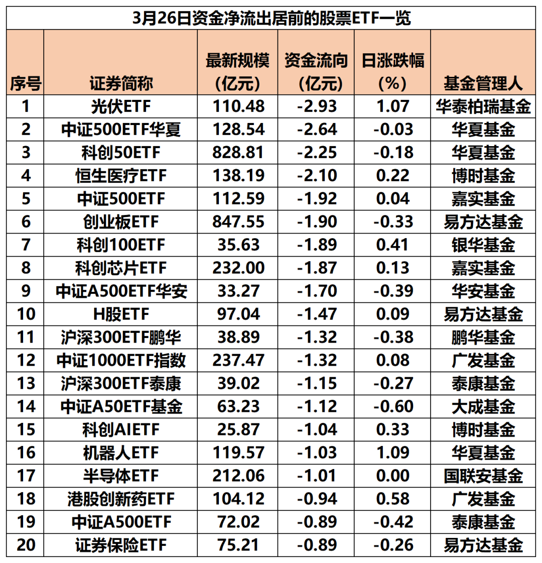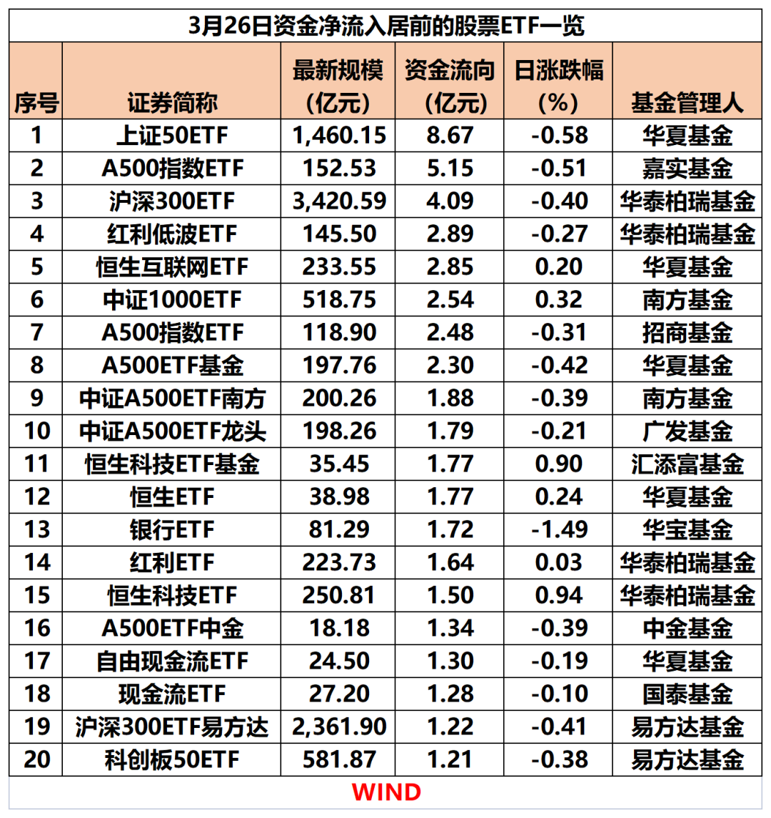 3月25日,三大指数窄幅震荡,农林牧渔、人形机器人概念轮番演绎。股票ETF单日吸金超42亿元。其中,上证50ETF、A500指数ETF、沪深300ETF等多只宽基ETF产品位居资金净流入排行榜前列,多只创业板ETF、科创100ETF、科创芯片ETF资金净流出居前。 股票ETF单日吸金超42亿元 Wind数据显示,3月26日股票ETF(含跨境ETF)整体资金净流入42.48亿元。细分品类中,宽基ETF和港股ETF资金净流入居前,分别达20.95亿元和9.62亿元。 具体到指数维度,3月26日,中证A500指数、上证50指数ETF资金净流入居前,分别达12.23亿元和9.25亿元;中证500指数ETF资金净流出居前,达4.59亿元。从5日角度观测,科创50指数ETF累计净流入47.99亿元。 基金公司方面,华夏基金旗下ETF中,3月26日,上证50ETF(510050)和恒生互联网ETF(513330)资金净流入居前,分别达8.67亿元和2.85亿元;最新规模分别达1460.15亿元和233.55亿元,对应跟踪指数近一月日均成交额分别为21.46亿元和51.30亿元。A500ETF基金(512050)资金净流入2.3亿元,恒生ETF(513660)和自由现金流ETF(159201)资金净流入都超1亿元。 易方达基金旗下ETF最新规模为6022.1亿元,2025年以来规模增加15.6亿元。从结构上看,沪深300ETF易方达(510310)资金净流入1.2亿元,科创板50ETF(588080)资金净流入1.2亿元,纳指ETF易方达(159696)资金净流入1.0亿元,A500ETF易方达(159361)资金净流入0.9亿元,恒生科技ETF易方达(513010)资金净流入0.8亿元。 上证50指数、A500指数、沪深300指数等宽基ETF成吸金主力 3月27日,上证50ETF、A500指数ETF、沪深300ETF等多只宽基ETF“霸榜”资金净流入排行榜。其中,华夏上证50ETF单日吸金超8亿元,位列资金净流入排行榜榜首。嘉实A500指数ETF、华泰柏瑞沪深300ETF单日资金净流入均超4亿元。