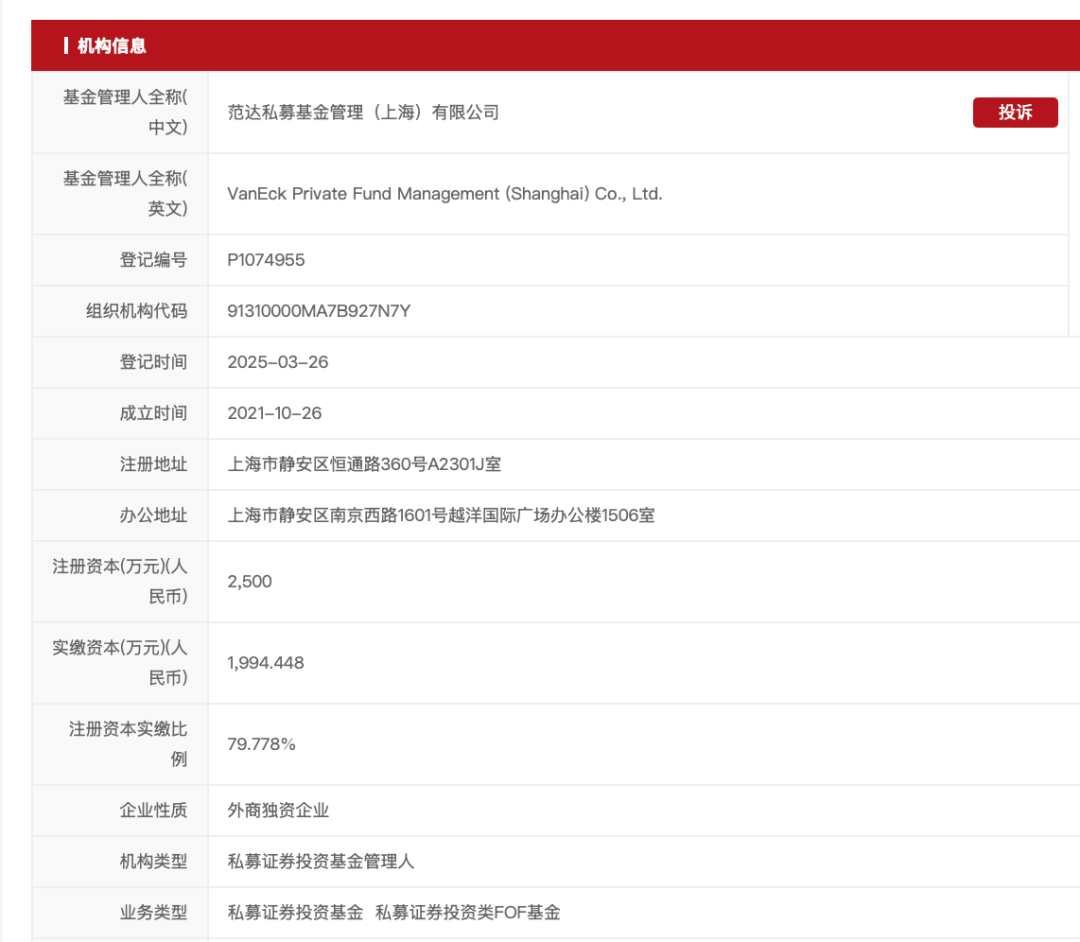 美国共同基金管理人、全球最大ETF管理人之一的范达,在中国布局再落一子。 中国证券投资基金业协会官网显示,范达私募基金管理(上海)有限公司(以下简称范达私募)已于2月26日在协会完成私募管理人登记。该公司注册资本为2500万元,为外商独资企业,实际控制人为范达集团有限公司(Van Eck Associates Corporation)(以下简称范达)。