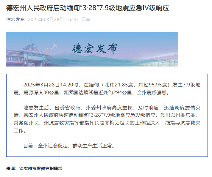 央视网消息:据“德宏发布”微信公众号消息,2025年3月28日14:20时,在缅甸(北纬21.85度,东经95.95度)发生7.9级地震,震源深度30公里,距我国边境线最近处约294公里,德宏全州震感强烈。地震发生后,云南省委省政府、德宏州委州政府高度重视、及时响应,迅速调度震情灾情。德宏州人民政府快速启动缅甸“3·28”7.9级地震应急Ⅳ级响应,派出以德宏州委常委、常务副州长、州抗震救灾指挥部指挥长赵冬梅为组长的工作组深入一线指导抗震救灾工作。目前,德宏全州社会稳定,群众生产生活正常。