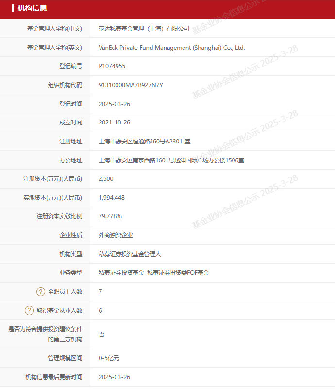 又一家外资私募“落子”中国市场。 近日,中国证券投资基金业协会官网显示,范达私募基金管理(上海)有限公司(下称“范达私募”)已在协会完成私募管理人登记。 记者了解到,范达私募为2025年首家完成备案登记的外资证券类私募,同时也标志着我国证券类外资私募阵营进一步扩容。 受访人士认为,外资私募“落子”中国市场,能倒逼中国私募机构提升竞争力,推动私募行业进步。同时,这也能丰富私募市场结构,满足基金投资者多样需求,并不断促进私募行业国际化。不过,部分中小型私募可能面临更大竞争压力,私募行业整合或加速。 外资私募阵营扩容 中国证券投资基金业协会官网显示,范达私募已于3月26日在协会完成私募管理人登记。
