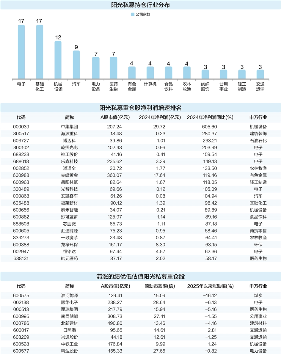 证券时报记者 梁谦刚 A股市场上,阳光私募持仓风格独树一帜,其仓位配置相对灵活,既会布局行业龙头,也热衷挖掘中小市值潜力股,对新兴产业的布局更是快人一步,像人工智能、新能源领域常能看到它们的身影。相较于其他机构分散投资以平抑风险,阳光私募有时会集中持仓,对看好的个股下重注,力求获取高额回报。 透过观察阳光私募持仓的情况,投资者可以窥见其在市场跌宕起伏的过程中,是如何把握市场机会的。 持仓呈现多元化 随着2024年年报陆续披露,阳光私募持仓浮出水面。 据证券时报·数据宝统计,截至目前,已披露2024年年报的上市公司中,共有115家公司前十大流通股东名单中出现阳光私募的身影。 从整体持仓数据来看,阳光私募在投资布局上展现出多元化的特征。所涉上市公司的A股市值跨度极大,有海波重科、威博液压、中科美菱、*ST佳沃、*ST东晶等A股市值不到20亿元的小公司。再到千亿级的行业巨头,如紫金矿业A股市值高达3739亿元。 这表明阳光私募既重视行业龙头企业的稳定性和强大市场影响力,又不放过中小市值企业在成长过程中蕴含的巨大潜力。 重仓八大行业 从行业角度来看,阳光私募持仓的公司共涉及26个行业。商贸零售、家用电器、社会服务、房地产、建筑装饰、传媒行业均只有1家公司入围。而电子、基础化工、机械设备、汽车、电力设备、医药生物等规模庞大的行业均有7家及以上公司入围。 从已公布年报来看,截至2024年底,阳光私募持仓市值超10亿元共有八大行业,分别是有色金属、电子、基础化工、商贸零售、机械设备、电力设备、计算机、医药生物。持仓市值最高的是有色金属行业,合计64.99亿元。有色金属行业共4家公司获阳光私募持仓,分别为紫金矿业、赤峰黄金、国城矿业、宏创控股。 有色金属龙头紫金矿业获阳光私募持仓市值51.69亿元,持仓市值排在第一位。2024年末,高毅资产旗下2只私募基金组合持仓该股,这2只阳光私募均在2024年第四季度实施了增持。 阳光私募持仓市值超亿元的个股共54只,除紫金矿业外,持仓市值靠前的还有汇通能源和维信诺等。 偏爱业绩向好公司 阳光私募的持仓选择与企业业绩之间存在着千丝万缕的联系。据数据宝统计,截至目前,阳光私募持仓的115家公司中,2024年实现盈利的公司占比超过八成,其中同比增长(含扭亏为盈)的公司有62家,占比达到五成以上。如光智科技、岳阳林纸、安凯客车、博迈科净利润实现扭亏为盈。中集集团、海波重科、乾照光电、乐鑫科技、道道全、赤峰黄金等净利润实现翻倍增长。 以乐鑫科技为例,2024年公司实现净利润3.39亿元,同比增长149.13%,主要得益于下游各行各业数字化与智能化渗透率不断提升,以及2023—2024年的新增潜力客户逐步放量。2024年末公司获得上海睿郡资产旗下3只私募基金持仓,合计持仓市值达到8.79亿元。 上述业绩增长的62家公司中,阳光私募增持的公司数量偏多。数据显示,共有29家公司2024年第四季度期间获得阳光私募增持。精达股份、汇通能源、安凯客车、中科星图获阳光私募增持超千万股。12家公司获阳光私募基金减持,其中天地科技遭阳光私募减持数量最多,达到1512.63万股。 从估值水平来看,截至3月28日收盘,上述62家公司中,近半数滚动市盈率低于30倍,6家公司滚动市盈率不足15倍,分别是云天化、中铁工业、天地科技、兴通股份、北新建材、日照港。云天化滚动市盈率为7.99倍,排在最低位置,2024年公司实现净利润53.33亿元,同比增长17.93%。云天化化肥总产能1000万吨/年,其中尿素260万吨/年、磷肥555万吨/年、复合肥185万吨/年,是目前国内最大的化肥生产企业之一。 从二级市场表现来看,上述滚动市盈率低于30倍的公司当中,今年以来股价跑输同期上证指数的有9家,包括淮河能源、顺络电子、丽珠集团、南网储能、北新建材等。淮河能源累计下跌16.12%,是跌幅最大的一家公司。 |