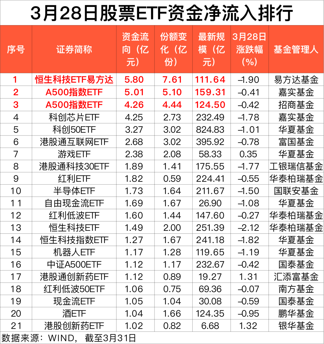 3月28日,A股市场延续调整态势,截至当日收盘,沪指跌0.67%,深成指跌0.57%,创业板指跌0.79%。贵金属板块、创新药板块涨幅居前,化工、风电设备等板块普遍回调,下跌个股合计超过4300只。 当日股票ETF市场资金延续前一交易日的净流出态势,净流出0.56亿元。值得注意的是,“含科”相关ETF资金净流入明显。 股票ETF整体净流出0.56亿元 Wind数据显示,截至3月28日,全市场1024只股票ETF总规模为3.34万亿元。 按照成交均价测算,当日股票ETF整体净流出资金为0.56亿元。细分品类中,Smart Beta ETF和行业ETF净流入居前,分别净流入7.63亿元和7.13亿元。宽基ETF净流出居前,净流出资金为27.12亿元。规模变化方面,宽基ETF规模减少140.91亿元。 具体到指数维度,3月28日,恒生科技、中证A500指数净流入居前,分别净流入10.36亿元和6.93亿元;沪深300指数单日净流出居前,达15.16亿元。从5日角度观测,恒生科技指数累计净流入37.20亿元。 据易方达基金统计,流入排名前五名的板块为黄金、港股科技、半导体、中证A500、红利,分别净流入12.8亿元、12.5亿元、8.1亿元、6.9亿元和3.9亿元。 科技相关ETF资金净流入明显 从单只基金看,与指数资金变动一致。 资金净流入方面,全市场共有21只股票ETF资金净流入超1亿元,其中,科技相关ETF资金净流入明显。 具体来看,易方达基金旗下的恒生科技ETF易方达、嘉实基金旗下的A500指数ETF、招商基金旗下的A500指数ETF分别净流入5.8亿元、5.01亿元、4.26亿元,排名前三。此外,嘉实基金的科创芯片ETF、华夏基金的科创50ETF、富国基金的港股通互联网ETF分别净流入4.25亿元、3.27亿元和2.68亿元。