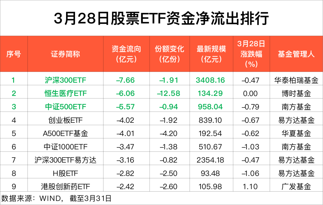 头部基金公司旗下ETF净流入步伐持续。数据显示,易方达基金ETF最新规模达6010.2亿元,2025年以来整体ETF规模增加3.7亿元。 资金净流出方面,华泰柏瑞基金旗下的沪深300ETF以7.66亿元的资金净流出居前,博时基金的恒生医疗ETF、南方基金的中证500ETF、易方达基金的创业板ETF等净流出资金紧随其后。