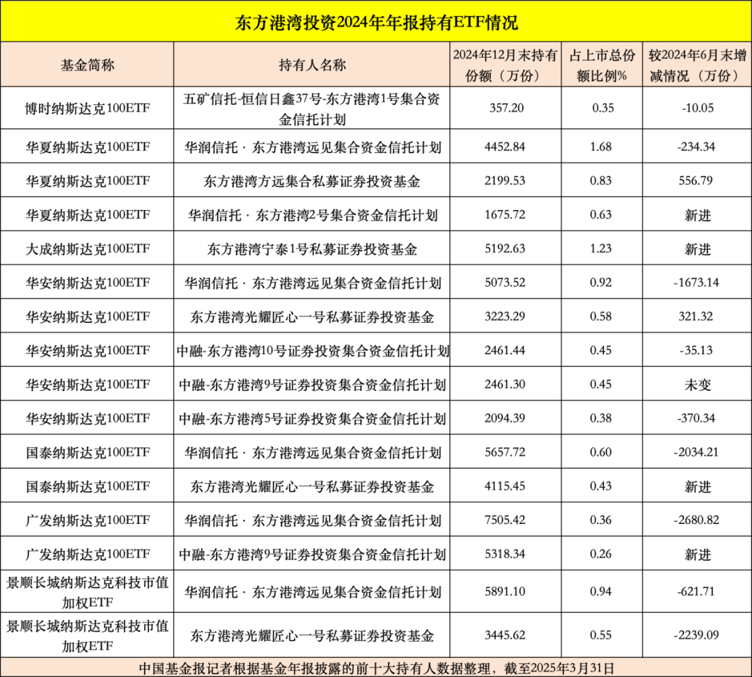 随着公募基金2024年年报的披露,ETF等上市基金的前十大持有人名单曝光。基金君梳理发现,有不少知名私募机构旗下的产品现身ETF的持有人名单。 随着ETF的快速发展,私募看好其配置价值。2024年下半年,但斌的东方港湾投资仍然重仓多只纳指ETF,景林资产减持中概互联网ETF;重阳投资大举加仓恒生医疗ETF,高毅资产邓晓峰新进了债券类的国开ETF;国新新格局私募减持了黄金ETF,泓湖投资加仓东南亚科技ETF。 东方港湾调仓多只纳指ETF,景林资产减持部分持仓ETF 截至3月31日,公募基金最新披露的2024年年报显示,但斌掌舵的东方港湾投资旗下的产品在去年四季度末仍然重仓多只纳指ETF,但是进行了一定调仓。