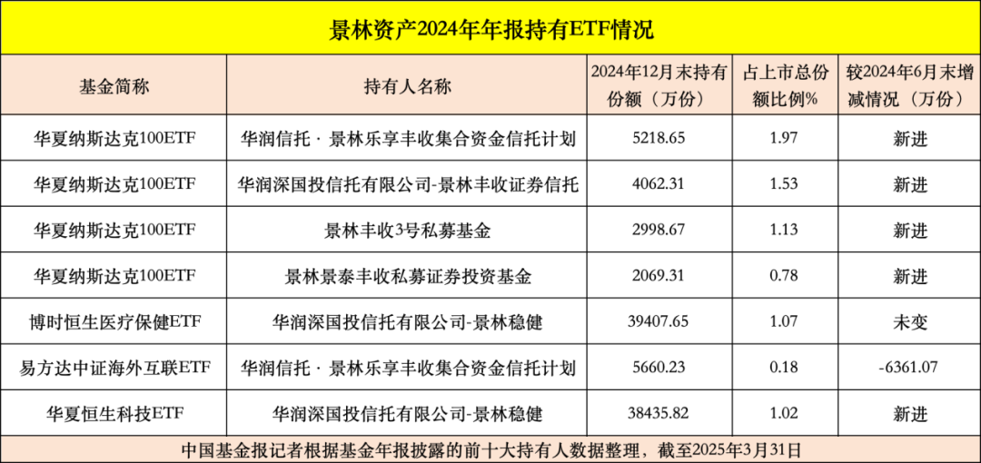 比如东方港湾光耀匠心一号等5只产品现身华安纳斯达克100ETF前十大持有人名单,合计持有1.53亿份,占上市总份额的2.78%,较2024年二季度末减持了1757万股左右,且有产品退出持有人名单。 同时,东方港湾光耀匠心一号、华润信托·东方港湾远见减持了景顺长城纳斯达克科技市值加权ETF合计2860.80万份,期末持有9336.72万份,占上市总份额的1.49%。 但是,东方港湾方远等三只产品加仓了华夏纳斯达克100ETF,持仓份额增至8328.09万份,占比为3.14%。另外,东方港湾旗下私募产品还持有广发纳斯达克100ETF共1.28亿份,占比为0.62%。 千亿私募景林资产也通过ETF进行一部分的投资布局。基金年报显示,景林丰收3号等四只产品在2024年下半年新进华夏纳斯达克100ETF前十大持有人名单,合计持有1.43亿份,占上市总份额的5.41%。