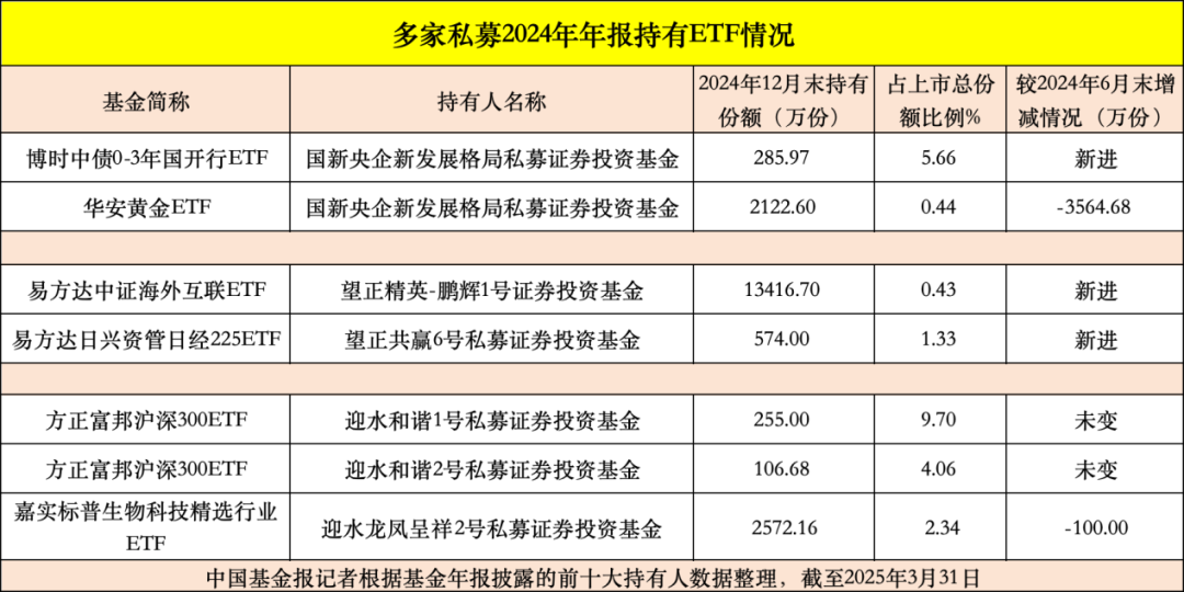 但是景林旗下多只产品退出了易方达中证海外互联ETF持有人名单,仅留下华润信托·景林乐享丰收集合信托持有该ETF共计5660.23万份,较去年年中也是大幅减持。 景林旗下产品还持有华夏恒生科技ETF、博时恒生医疗保健ETF,分别买进了3.84亿份、3.94亿份。 高毅、重阳也买ETF布局,国新新格局减持黄金ETF 值得一提的是,高毅资产、重阳投资等以主动投资见长的知名私募机构,也在2024年下半年买进了多只股票ETF或债券ETF。 公募基金年报显示,老牌私募重阳投资在2024年下半年布局了博时恒生医疗保健ETF,旗下重阳战略才智基金等五只产品合计持有该ETF共计21.48亿份,占上市总份额的5.82%。