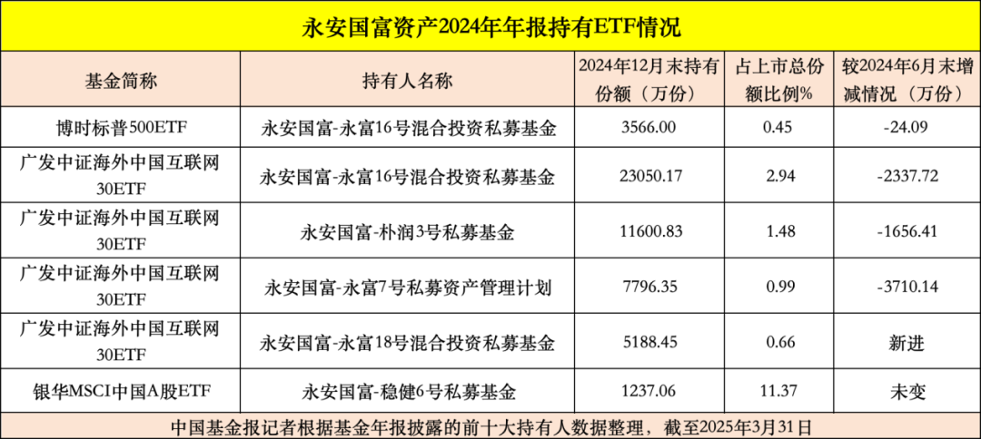 另外,望正资产在2024年下半年买进了易方达中证海外互联ETF、易方达日兴资管日经225ETF,分别持有1.34亿份、574万份。 迎水投资小幅减持嘉实标普生物科技精选行业ETF,仍然持有2572.16万份,还持有方正富邦沪深300ETF。 宏观策略私募也喜欢布局ETF,私募成为ETF重要“买手”之一 泓湖投资、永安国富资产两家宏观策略的私募也是买ETF的大户。 基金年报显示,永安国富在2024年下半年减持了广发中证海外中国互联网30ETF,但仍然持有4.76亿份,占上市总份额的6.07%。同时,其还减持了博时标普500ETF,持仓份额降至3566万份。