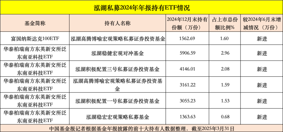 泓湖投资者旗下的泓湖稳健宏观对冲基金等五只产品在去年下半年加仓华泰柏瑞南方东英新交所泛东南亚科技ETF,合计持有1.76亿份,占上市总份额的8.84%;同时,泓湖高腾博喻宏观策略私募基金新进富国纳斯达克100ETF持有人名单,持有1562.69万份,占比为1.60%。
