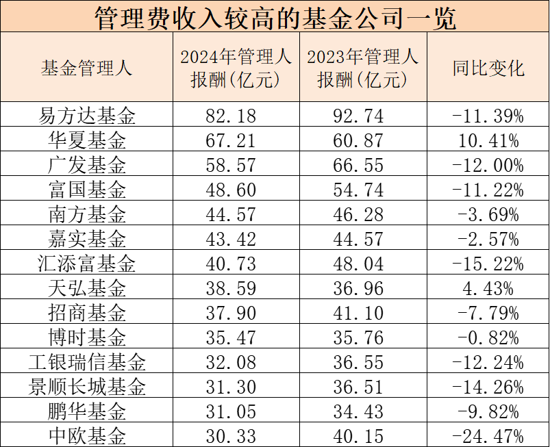 天相投顾统计显示,2024年全年基金公司管理费收入总计达到1226.78亿元,相比2023年同期的1333.46亿元下滑8%。分阶段对比来看,2024年上半年,基金公司管理费收入一度同比下滑13.84%,下半年在A股市场回暖带动下,权益基金规模回升,管理费收入降幅收窄。 分类型看,混合型基金2024年全年管理费收入达377.49亿元,相比2023年同期的557.50亿元,大幅下滑了32.29%,占比也从2023年的41.81%下滑至30.77%。但是,混合型基金仍然是公募基金管理费收入贡献最大的一类基金。 货币基金和债券基金也是管理费收入的主力军。2024年全年这两类基金管理费分别达到324.20亿元、284.60亿元。在去年债券市场牛市行情推动下,两类基金规模双双增长,带动管理费同比分别增长12.00%、13.03%。 股票型基金全年管理费为189.22亿元,同比下滑2.14%;FOF管理费为6.79亿元,同比降24.52%。 QDII、商品型基金2024年管理费均大幅增长,但由于规模较小,增长的绝对值有限。 14家管理费收入超30亿元 天相投顾统计显示,2024年全年,161家公募基金公司中,有14家公司管理费收入超过30亿元。其中,管理规模最大的易方达基金以82.18亿元的管理费收入,在收入榜中稳居第一。