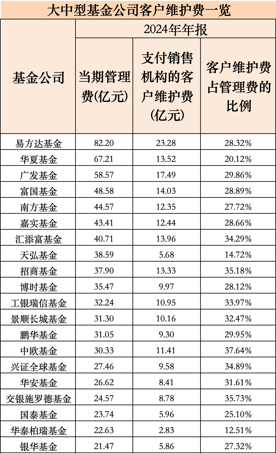 华夏、广发基金紧随其后,2024年全年管理费收入分别达到67.21亿元和58.57亿元。除此之外,包括富国、南方、嘉实、汇添富在内的四家基金公司管理费收入超过40亿元,包括天弘、招商、博时、工银瑞信、景顺长城、鹏华、中欧在内的7家基金公司管理费收入超过30亿元。 受大环境影响,多家基金巨头的管理费收入同比都出现不同程度的下滑。其中,易方达基金管理费收入同比下滑11.39%。上述14家基金公司中,仅指数业务占比较高的华夏基金和天弘基金管理费实现增长,两家基金公司管理费收入同比分别增长10.41%和4.43%。固收业务占比较高的博时基金管理费收入也仅微幅下滑0.82%。 基金行业管理费收入分化依旧严重,14家头部基金公司合计管理费收入在全行业中占比达到50%。管理费收入低于1亿元的基金公司高达57家,在全行业基金公司中数量占比超过35%。 客户维护费达346.52亿元 客户维护费也称为尾随佣金,是基金公司从管理费中按一定比例支付给销售渠道的费用。 天相数据显示,2024年全年,基金公司支付的客户维护费达到346.52亿元,受管理费下滑影响,客户维护费也出现下滑,2024年同比下降8.92%,与管理费降幅基本持平。