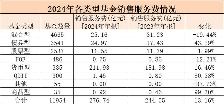 从基金公司的情况来看,尾随佣金占管理费收入比例的差异较大,头部基金公司的客户维护费占比在20%~30%之间,部分基金管理人尾随佣金占管理费收入比例较高,如联博、贝莱德、朱雀、汇泉、达诚、泉果、恒越、华宸未来、施罗德、西藏东财基金等基金公司尾随佣金占比超过40%。 剔除基金公司向销售机构支付的客户维护费,基金公司取得的公募基金管理费净收入约为879.98亿元。 销售服务费达276.74亿元 在上述费用之外,不少基金C类、E类、D类等份额收取的销售服务费也受到业界关注。