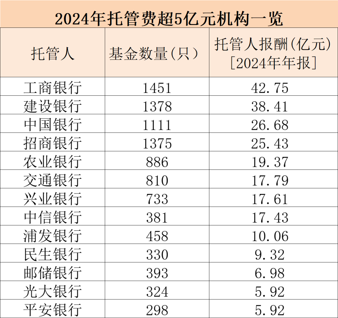天相投顾数据显示,2024年基金销售服务费收入合计276.74亿元,较2023年同期的244.55亿元增长了13.16%。 其中,货币基金2024年收取销售服务费211.93亿元,在全部销售费用中占比达到76.58%。混合型、债券型和股票型基金的销售服务费分别达到25.16亿元、24.97亿元、11.55亿元,其他类型基金销售服务费较少。 从基金公司来看,2024年收取销售服务费收入最高的为天弘基金,达23.16亿元。易方达、南方基金、广发基金、华夏基金、汇添富基金等紧随其后,销售服务费收入均超过10亿元。 基金托管费达274.17亿元 基金托管费也出现同比下滑。天相投顾统计显示,2024年58家托管机构合计收取基金托管费收入274.17亿元,与去年同期的284.96亿元相比,下降3.79%。 具体来看,2024年托管费收入超过20亿元的商业银行共计8家,合计托管费金额达198.11亿元,占比72%。