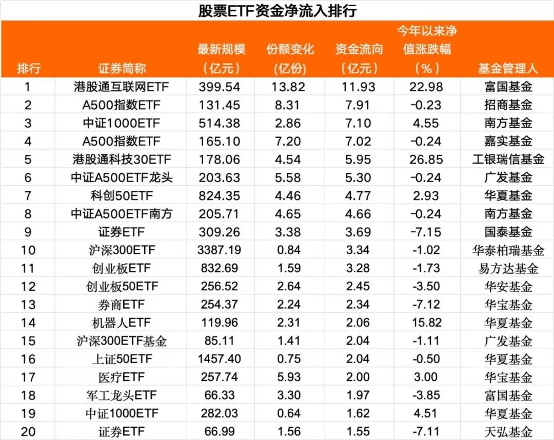 3月31日(本周一),A股市场震荡调整,三大指数集体收跌。其中,创业板指跌幅超1%,两市成交额超过1.2万亿元。 3月31日,股票ETF获百亿元资金净流入,跟踪中证A500、中证1000等指数的宽基ETF,以及港股互联网、非银金融等行业主题类ETF资金净流入靠前。 3月份,股票ETF整体获资金净流入。期间,部分代表性港股科技、港股互联网等ETF“吸金”超300亿元。 周一股票ETF资金净流入百亿元 Wind数据统计,截至2025年3月31日,全市场股票ETF达到1038只(含跨境ETF,下同),总规模为3.32万亿元。 资金流向显示,3月31日,市场震荡之际,股票ETF净流入资金近百亿元。当日资金净流入超过1亿元的股票ETF达30只,宽基ETF吸金居前。富国港股通互联网ETF、招商A500指数ETF、南方中证1000ETF位居前三,资金净流入均超7亿元。 来自易方达基金的数据显示,3月31日,以下宽基ETF或行业主题ETF资金净流入居前,分别为跟踪中证A500指数的ETF(净流入20.5亿元)、港股互联网类ETF(净流入12.0亿元)、跟踪中证1000指数的ETF(净流入10.5亿元)、非银金融类ETF(净流入8.6亿元)。 黄金价格迭创新高。3月31日,黄金ETF获得了超过25亿元资金净流入。 Wind统计显示,资金净流入前20大股票ETF中,跟踪中证A500指数的ETF达4只,港股科技或互联网相关ETF为2只,跟踪中证1000、创业板指数的宽基指数ETF,以及券商ETF均各2只。从近5个交易日角度观测,跟踪中证A500指数的ETF累计获净流入超39亿元,跟踪恒生科技指数的ETF获净流入也超过了33亿元。 头部基金公司中,3月31日,易方达基金旗下黄金ETF资金净流入3.7亿元,创业板ETF净流入3.3亿元,科创板50ETF净流入1.2亿元,云计算ETF净流入1.1亿元A500ETF易方达净流入0.6亿元。 华夏基金ETF中,3月31日,科创50ETF和机器人ETF单日资金净流入居前,分别净流入4.77亿元和2.06亿元,最新规模分别达824.35亿元和119.96亿元,对应跟踪指数近一月日均成交额分别为39.44亿元和12.14亿元。上证50ETF净流入也超2亿元,中证1000ETF和自由现金流ETF分别净流入1.62亿元和1.13亿元。