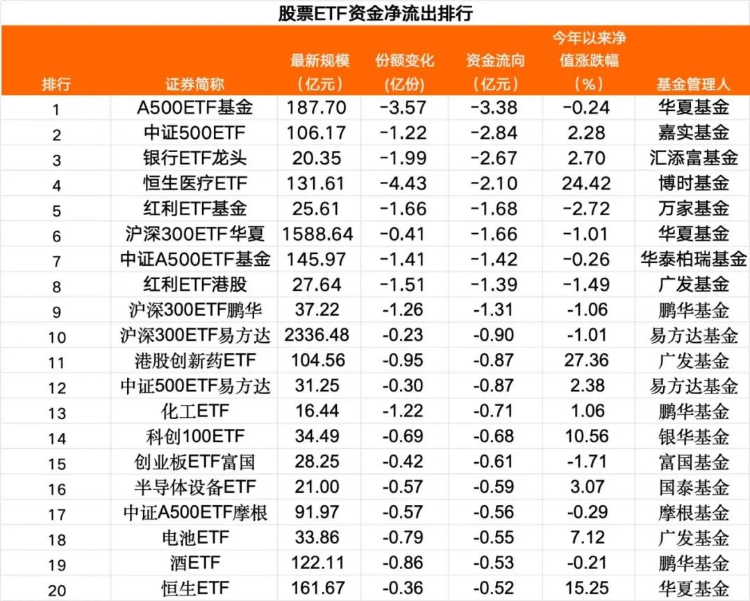 部分宽基和行业ETF资金净流出居前 3月31日,股票ETF净流出超过1亿元的有9只,其中跟踪中证A500、中证500等指数的宽基ETF,以及银行、恒生医疗等行业主题ETF“失血”靠前。 Wind数据显示,3月31日,资金净流出前20大股票ETF中,部分宽基ETF净流出金额居前。3只跟踪中证A500指数的ETF合计净流出超5亿元;3只跟踪沪深300指数的ETF净流出接近4亿元,2只跟踪中证500指数的ETF净流出超3.7亿元。 3月以来,虽然市场持续震荡调整,但是股票ETF合计“吸金”近50亿元。港股通互联网、港股通科技、科创50、恒生科技等相关ETF资金净流入居前,跟踪沪深300指数、上证50指数的等宽基ETF成为资金净流出主阵营。 易方达基金胡文伯表示,考虑到2025年政策对资本市场的定位提升以及呵护态度,指数整体下跌的空间不大。但由于当前市场对于政策预期相对充分,倾向于观察赤字率定调等政策细节落地,在政策信号落地前指数预计整体趋于震荡,若观察到信号反转,则股市有望迈入基本面驱动阶段。 华夏基金钟帅表示,2025年尽管经济基本面依然困难重重,但中国经济仍具备较强的内生增长潜力。希望经济刺激政策能够进一步释放市场活力,以使得经济基本面能够得到切实改善。相信技术进步的力量,人工智能技术的巨大进步将在不远的将来彻底改变人类社会的面貌,以人工智能为核心的数字经济产业链将成为贯穿全年的市场主线。