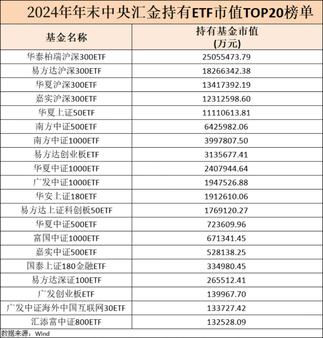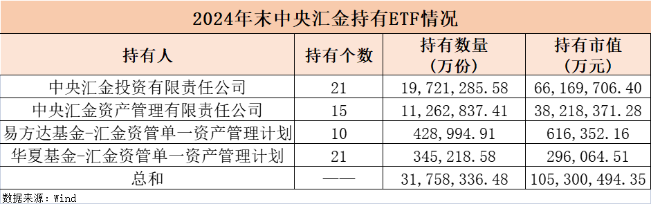随着公募基金2024年年报披露完毕,以汇金系为代表的“国家队”持仓也得以揭晓。 目前,中央汇金投资ETF分为4大主体,分别是中央汇金投资有限责任公司(以下简称汇金投资)、中央汇金资产管理有限责任公司(以下简称汇金资管)、易方达基金—汇金资管单一资产管理计划和华夏基金—汇金资管单一资产管理计划。 去年下半年,中央汇金大笔加仓,截至年末ETF持仓已超1万亿元,环比增加近八成,同比更是激增7倍以上。对比来看,中央汇金去年下半年借助ETF对A股市场进行了全面布局,聚焦大盘蓝筹与聚焦中小成长板块的宽基ETF均获汇金增持,部分细分主题ETF也获新进资金流入或加仓。 中央汇金持有ETF总市值突破万亿元,环比大增近八成 Wind数据显示,截至2024年末,中央汇金持有ETF的份额合计3176亿份,持仓市值合计1.05万亿元。 与2024年中相比,2024年末“国家队”持有ETF的份额增加819亿份,持仓市值增加4625亿元,增幅为78.31%。 2024年,中央汇金对ETF的“扫货”力度惊人。与2023年末相比,中央汇金持有ETF的份额增加2669亿份,规模增长近9300亿元,持仓市值更是激增7.87倍。 具体而言,汇金投资持有ETF的数量为21只,与2024年6月末保持一致,持仓规模6617亿元;汇金资管持有ETF的数量为15只,较2024年6月末增加6只,持仓规模为3822亿元;易方达基金—汇金资管单一资产管理计划数量为10只,环比增加2只,持仓规模为62亿元;华夏基金—汇金资管单一资产管理计划持有ETF的数量由2024年6月末的20只增至2024年末的21只,持仓规模为30亿元。