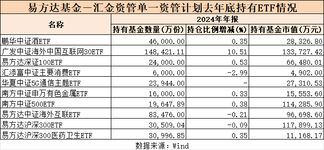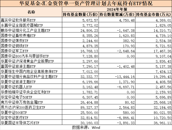 华夏基金—汇金资管单一资产管理计划则新进了华夏恒生中国内地企业高股息率ETF、华夏中证沪深港黄金产业股票ETF、永赢中证全指医疗器械ETF等。