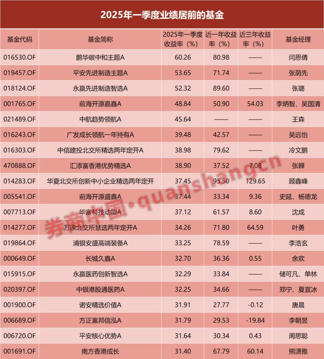 2025年一季度正式收官,在一场以AI、机器人领衔的结构性行情中,公募基金取得了不俗的战绩。 Wind数据显示,今年一季度的基金业绩排行榜,主要由机器人主题基金、北交所基金、港股基金三类基金占据,其中鹏华基金基金经理闫思倩管理的鹏华碳中和主题A重仓多只机器人牛股,以60.26%的收益率成为2025年一季度业绩第一的基金。 此外,值得一提的现象是,主动权益基金全面回暖,业绩排行榜重回主动权益的天下。一批主动权益基金凭借对行情的灵活把握以及对牛股的提前挖掘,业绩大幅领先于被动产品。 机器人主题基金大赚60% 从业绩和重仓方向来看,公募基金2025年一季度的业绩排行榜由重仓机器人的基金霸屏。 其中,闫思倩管理的鹏华碳中和主题A以60.26%的收益率,成为2025年一季度业绩第一的基金。截至去年末,该基金重仓了北特科技、禾川科技、五洲新春、步科股份、双林股份等多只机器人概念股,其中双林股份年内涨幅118.16%,股价翻倍,或为该基金贡献了丰厚的收益。