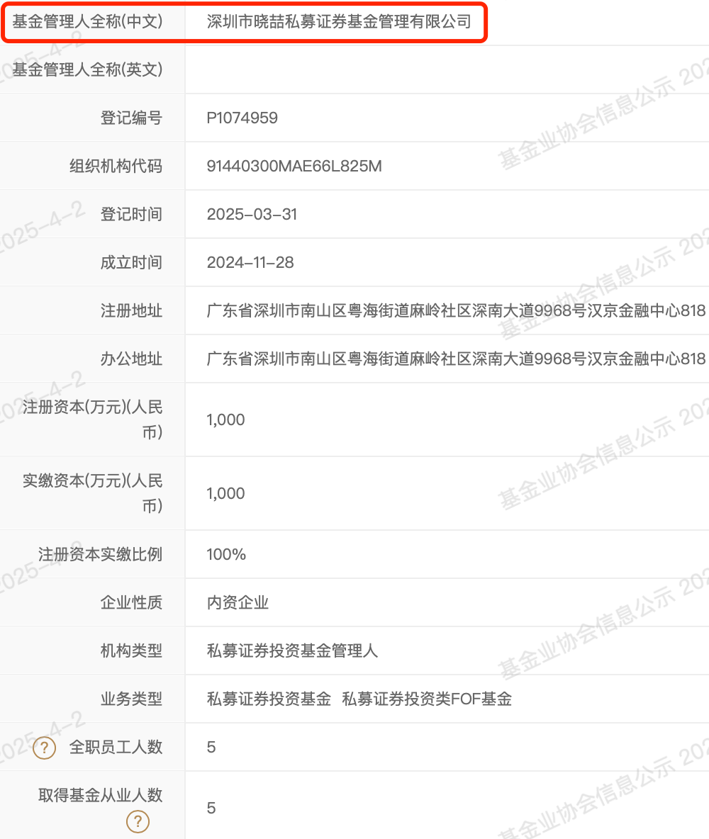 近期,中国证券投资基金业协会(以下简称协会)发布了新一批完成备案登记的私募基金管理人名单,涉及6家机构。 基金君发现,长城证券原副总裁徐浙鸿在退休后自主创业,与老同事一起创立了深圳市晓喆私募证券基金管理有限公司(以下简称晓喆私募基金),未来将在私募的舞台上大展拳脚。 近一年已有多位拥有券业背景的资深人士加入私募行业,希望实践创业的想法,开启职业生涯新篇章。 晓喆私募基金完成备案登记,三位合伙人均是资深女将 协会网站信息显示,晓喆私募基金成立于2024年11月28日,并于2025年3月31日完成私募证券投资基金管理人登记。这家新锐私募机构的注册资本为1000万元,注册和办公地都在深圳市南山区,目前有5名全职员工。