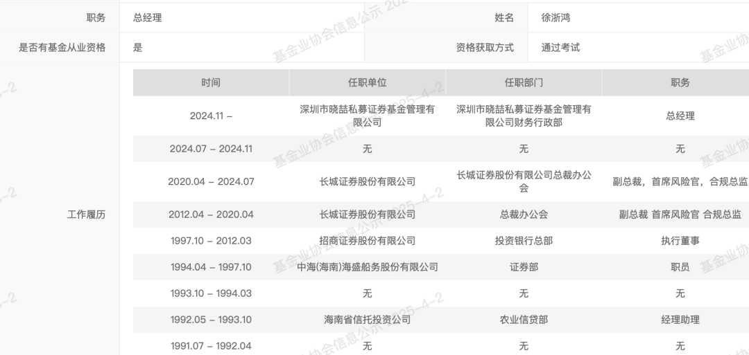 公开资料显示,现年56岁的徐浙鸿拥有超过30年的金融行业从业经验,1992年5月加入海南省信托投资公司,任农业信贷部经理助理;1994年4月至1997年10月,任中海(海南)海盛船务股份有限公司证券部职员;1997年10月加入招商证券,担任投资银行总部执行董事,她在招商证券工作将近15年,于2012年3月离开。 2012年4月徐浙鸿加入长城证券,历任长城证券投资银行事业部质量控制部总经理、资本市场部总经理,随后担任公司投行业务总监;2015年7月她出任公司合规总监,2016年12月还担任公司首席风险官,2017年7月任公司副总裁。 根据长城证券发布的公告,2024年6月,因到龄退休,徐浙鸿女士换届后不再担任副总裁职务。 2024年11月,退休后的徐浙鸿重启事业新征程,和招商证券原投资经理彭小泉携手创业,成立了晓喆私募基金,并出任公司总经理一职。