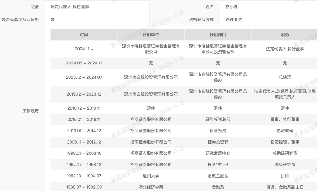 晓喆私募基金实际控制人是彭小泉,她在业内的资历也非常深厚。 资料显示,彭小泉是中南财经大学金融学博士,早年从教,1997年7月进入金融行业,加入了招商证券,先后担任高级研究员、投资经理、董事、执行董事等职务,负责宏观经济研究、资产配置、证券投资策略、管理部分自营账户,2013至2014年期间曾任公司分管领导助理。2018年12月彭小泉退休,她的金融从业生涯主要在招商证券,长达21年之久。 2019年彭小泉参与筹建深圳市白鲸投资,同年12月出任公司总经理,但2024年7月她离开了白鲸投资。2024年11月彭小泉二次创业,创立晓喆私募基金,担任公司法定代表人、执行董事。