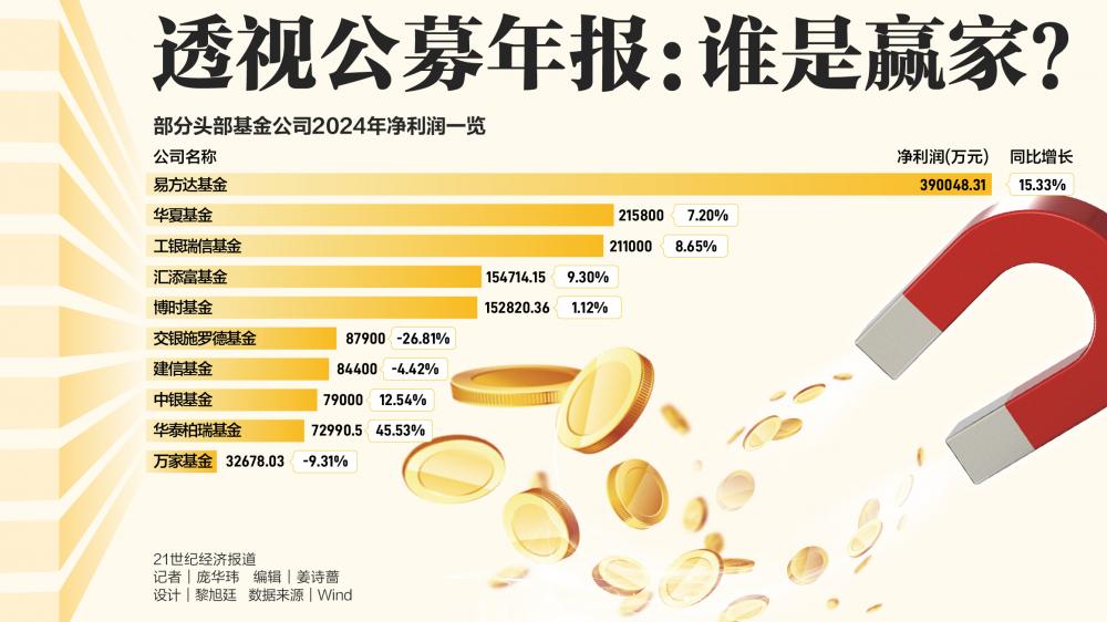 随着上市公司披露2024年年报,它们控股参股的基金公司经营业绩随之揭晓。 2024年基金年报显示,在市场震荡和基金降费的双重压力下,公募行业承压,大量公司营收下滑。 不过,各家基金公司的悲喜并不相通,2024年基金公司盈利分化明显。一批头部基金公司凭借丰富多元的产品线和降本增效策略,实现利润优化和快速发展,比如易方达基金、华夏基金、华泰柏瑞基金。 反观一大批中小型基金公司,因业务单一,受基金降费影响,经营业绩出现较大幅度下滑。 尽管基金降费带来2024年全行业营收业绩的阵痛,但也迫使各家基金公司加速业务转型。比如,易方达、华泰柏瑞、华夏、南方等基金公司“跑马圈地式”抢占指数基金和ETF赛道;大量资金涌入债券基金背景下,广发基金、工银瑞信、中银基金、兴业基金等债基规模快速增长。 “基金行业分化比较严重,头部效应未来会很明显,中小型基金公司需凭借差异化竞争寻求持续发展。”一位基金经理说。