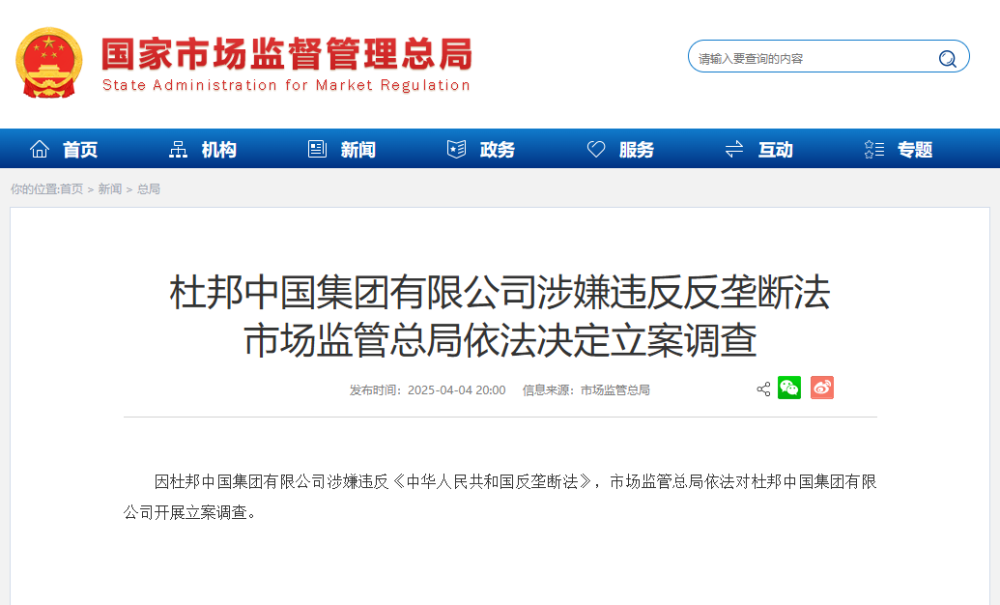 因杜邦中国集团有限公司涉嫌违反《中华人民共和国反垄断法》,市场监管总局依法对杜邦中国集团有限公司开展立案调查。
