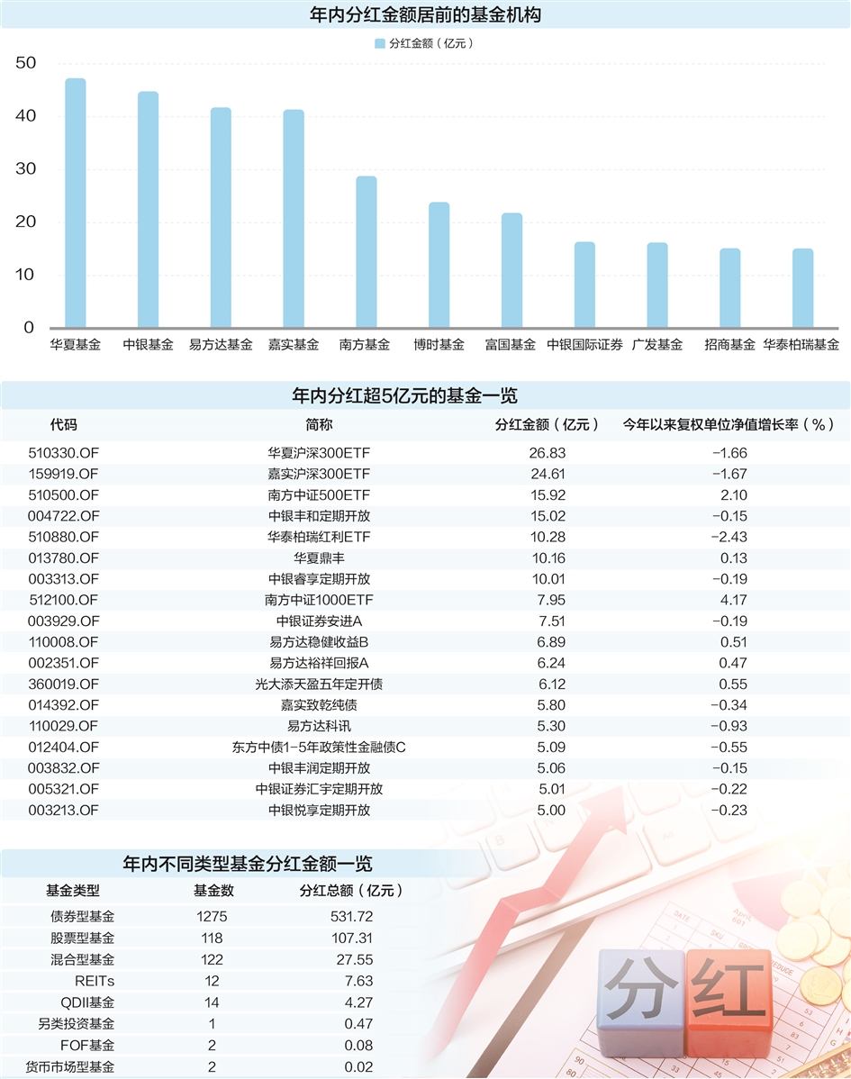 证券时报记者 郭洁 2025年以来,A股市场整体呈现震荡上行态势,权益类基金净值普遍增长。指数基金表现突出,部分指数基金还推出了“季度分红”“月度分红”等机制,将红利尽可能及时地转化为投资者现金收益。 据证券时报·数据宝统计,按照红利发放日统计,截至目前,今年以来已有123家公募基金或证券公司旗下1546只(多类别份额分开统计)基金产品实施分红,分红总额达到679.04亿元。 年内分红总额超过10亿元的基金公司有19家,华夏基金、中银基金、易方达基金、嘉实基金等公司的分红总额居前,分别达47.27亿元、44.78亿元、41.75亿元、41.36亿元,排名前四位;此外,南方基金、博时基金、富国基金等公募基金,年内分红总额均超20亿元。 从产品数量来看,易方达基金、博时基金、广发基金、鹏华基金、富国基金等均有超40只产品实施分红,其中易方达基金、博时基金旗下分红产品数量居前,分别达71只和70只,分红总额分别达41.75亿元和23.85亿元。 债基依旧是分红主力 一般而言,基金分红金额越高,次数越多,说明基金的可分配利润越多,反映其在特定阶段的投资较为成功。 分类型来看,债券型基金年内依然最为慷慨,分红金额最高。据数据宝统计,截至最新,今年以来分红的债券型基金有1275只,分红金额达到531.72亿元,占基金年内分红总额的78.3%。219只债券型基金年内至少实施2次分红。今年以来,政策空窗期叠加资金收紧,债市持续调整,绝大多数债基年内并未斩获正收益。 业内人士表示,债基大手笔分红主要是近年来债券市场走出牛市行情,投资者对债基的配置增加。在市场和规模双双向好的情况下,债券型基金收益增加,分红的频次和金额进一步提高。此外,债基持有人中的机构投资者占比较高,对分红的需求较强。 QDII基金分红金额同比大增 以可比数据统计,今年以来QDII基金、股票型基金、混合型基金的分红金额均同比呈现爆发式增长。QDII基金由于基数低,增幅最高,分红金额从去年同期的0.18亿元增长至今年内的4.27亿元,增幅高达2270.04%。股票型基金和混合型基金的分红金额分别同比增长744.96%和626.90%。 今年以来,在多重因素的共同影响下,黄金、铜等大宗商品在一季度价格大涨,导致大宗商品类QDII基金净值大幅上涨,为分红提供了基础。 此外,今年以来港股市场表现强劲,恒生科技指数、恒生生物科技指数等大幅走高,港股类QDII基金收益较为可观,提升基金分红能力。另外,部分QDII基金合同规定需定期分配收益,黄金和港股等投资标的大幅上涨后,基金管理人选择提高分红比例,以帮助持有人锁定收益或控制基金规模。 债券型基金相比去年增幅也不低,今年内的分红金额相比去年同期增长153.37%。年内A股市场整体向上和债市相对稳定,股票型基金、混合型基金的投资收益都大幅上升,部分基金公司根据市场环境和投资策略做出主动调整,通过分红降低基金单位净值,以吸引更多投资者进入,同时降低仓位,减轻管理压力。 此外,REITs基金年内分红额同比增幅相对较低,为47.24%;另类投资基金、货币市场型基金的分红额则同比出现降低,幅度均为30%左右。 18只产品分红超5亿元 18只基金产品的年内分红金额超过5亿元。华夏基金旗下的华夏沪深300ETF年内分红总额最高,该基金年内分红1次,单次分红规模为26.83亿元。嘉实沪深300ETF年内分红1次,分红总额为24.61亿元,仅次于华夏沪深300ETF。 6只基金年内分红次数超4次,率先实现月月分红的频率,合煦智远嘉悦利率债A年内分红次数最多,达6次,合计分红金额3.17亿元。湘财鑫睿A、合煦智远嘉悦利率债C的分红次数均超4次。 从行情表现来看,年内分红超1亿元的149只基金年内平均收益率超5%,其中工银全球配置人民币、南方中证1000ETF、博时裕通纯债3个月A、易方达价值精选基金年内复权净值增长率居前,均超3%。 |