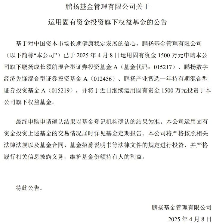 上述四家公募基金公司中,包含多家最新管理规模超6000亿元的大型公募,自购金额合计将达到2.05亿元。其中,招商基金和博时基金同属招商系。此前,招商局集团旗下7家上市公司招商蛇口、招商港口、招商轮船、招商公路、中国外运、辽港股份、招商积余集体宣布将加快实施股份回购计划,以维护广大投资者的利益,增强投资者对公司的投资信心,稳定及提升公司价值。 《国际金融报》记者从其他多家公募处了解到,虽近期暂未发布自购公告,但不排除后续会有自购产品的可能。 今年以来,基金公司的自购行为更加频繁。公募排排网数据显示,截至4月8日,公募基金公司合计自购95次,净申购金额达11.94亿元,涉及47家公募公司旗下95只基金。其中,权益类基金成为自购主力产品,股票型基金年内自购59次,净申购金额达5.71亿元,占全部基金净申购总额47.85%;混合型基金年内自购17次,净申购金额达1.7亿元,占全部基金净申购总额14.25%。 看好逆势机会 在业内人士看来,基金公司此时选择逆向投资,是在向市场传递看好的积极信号。 华夏基金认为,2025年市场或呈现“外险先至,内援后到”的态势,当下正处于关键节点。尽管美国的关税政策短期内会抑制双边贸易,对我国出口造成压力,加大市场波动态势。但从中长期来看,中国依托全球最完整的工业体系、持续突破的科技创新生态、纵深广阔的国内市场,将加速重构全球经济增长范式。 从市场表现看,华夏基金表示,目前风险偏好开始有所修复,从本周二涨停个股比例大幅提升来看,市场有望步入修复阶段。而周一快速的下跌包含了足够多的悲观预期,本周大概率处于“不能更糟”时刻。此外,叠加中国权益资产整体估值仍然是估值洼地,当下或是一次重要逆向布局时刻。 方正富邦基金经理乔培涛认为,尽管市场短期震荡难以避免,但中国资本市场仍展现出较强的抗跌韧性。 “我国在激发内需潜力方面具有显著政策纵深,随着二季度稳增长政策的持续加码,消费复苏主线或将成为A股市场的重要支撑。美股大跌更深层次的原因在于,其过去多年蕴含的高估值风险集中释放。相比之下,A股市场当前整体估值不高,权益资产具备较高投资性价比。”乔培涛表示。 具体到投资上,乔培涛建议,短期可关注高股息(电力、公路、银行)、内需(地产基建、航空、军工)、自主可控国产替代(半导体材料、医疗设备),以及受益关税反制(农业、稀土)。中长期看,新质生产力领域的优势正逐渐显现,新科技浪潮仍在涌现,继续看好以新质生产力为代表的成长板块。 |