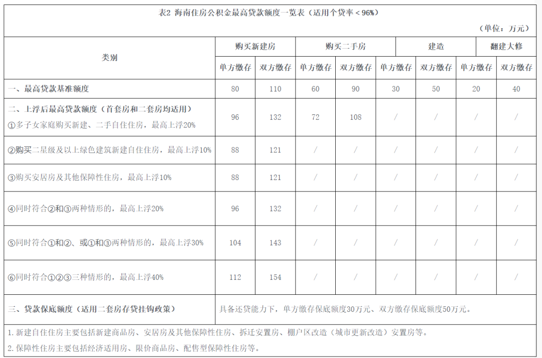 同时,上浮了多子女家庭、购买绿色建筑住房、购买安居房及其他保障性住房的最高贷款额度。其中,二孩及以上多子女家庭在海南省购买新建、二手自住住房,家庭最高贷款额度在基准额度基础上上浮20%;借款人家庭在海南省购买二星级及以上绿色建筑项目新建自住住房,家庭最高贷款额度上浮10%;借款人家庭在海南省购买安居房及其他保障性住房,家庭最高贷款额度上浮10%。 借款人家庭同时符合上述多项额度上浮条件的,最高贷款额度上浮比例可叠加。具体见下表2。