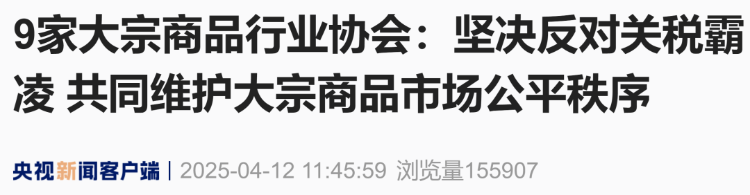 大宗商品行业协会也发声! 4月12日,据央视新闻报道,中国物流与采购联合会大宗商品流通分会联合中国物资储运协会、中国物资再生协会、中国金属材料流通协会、中国化工流通协会、中国机电产品流通协会、中国木材与木制品流通协会、中国汽车流通协会和中国农业机械流通协会联合发出《关于应对美国霸凌关税维护大宗商品市场和产业链供应链稳定的倡议》,代表中国大宗商品流通行业,坚决反对美国政府贸易保护主义的做法,坚决拥护中国政府为维护国家利益和全球大宗商品经贸秩序的一切应对措施。 上述9家大宗商品行业协会发出的倡议指出,近期,美国以各种借口宣布对包括中国在内的所有贸易伙伴滥施关税,造成全球大宗商品价格剧烈波动,严重扰乱世界经贸基本秩序,对大宗商品市场和产业链供应链稳定形成巨大冲击。 这9家大宗商品行业协会倡议全体会员和行业企业团结一致,共同应对美国贸易保护的挑战,积极构筑稳定、安全和可持续发展的全球大宗商品产业链供应链生态。 坚决反对美单边主义、保护主义和关税霸凌,共同维护大宗商品多边贸易体制,坚定推动大宗商品国际贸易和投资自由化、便利化。 积极利用中国超大规模市场优势,拓宽多元采购销售渠道,加强国际产能合作和分工协作、共同维护大宗商品产业链供应链稳定畅通。 积极参与国际规则制定,推动建立更加公平合理的国际贸易规则体系;联合国际伙伴共建大宗商品人民币计价体系和跨境结算体系。 大宗商品行业协会还将组织开展“大宗商品市场和产业链供应链护航行动”等专题活动,助力产业企业积极应对美国霸凌关税,促进全球经济和国际贸易的可持续发展。 4月11日,中国商业联合会、中国连锁经营协会、中国百货商业协会等8家协会发出倡议,各大企业应积极对接外贸企业,了解需求,规划合作,积极行动,化解外贸企业的燃眉之急。 京东、盒马和叮咚买菜等平台迅速响应,均在11日出手。其中,京东将在未来一年内,大规模采购不低于2000亿元出口转内销商品;盒马和叮咚买菜则通过释放需求、开通绿色通道等方式,帮助外贸企业拓展国内市场。此前,永辉超市、华润万家等线下商超已率先行动起来。 ![]() 综合自:央视新闻客户端