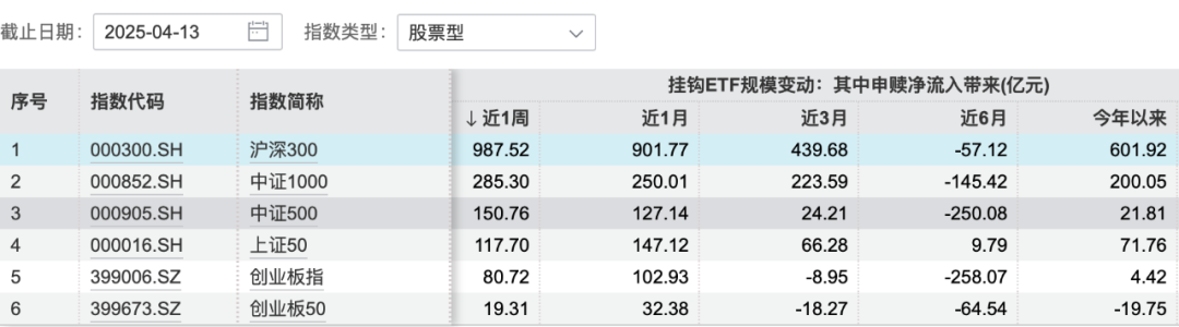 过去一周,A股市场跌宕起伏。但在政策“组合拳”呵护下,市场情绪逐渐修复,主要股指逐步反弹。 从资金层面看,过去一周ETF呈现大幅净流入趋势,融资融券余额也在周五触底反弹。有机构表示,机构投资情绪持续上行,显示市场已逐渐企稳。从多家券商的研判来看,市场后续大概率将进入区间震荡新格局,宜逢低增持。投资主线方面看好受益于扩内需的消费板块,自主可控领域,以及增持回购、业绩确定性方向。 资金流入显示市场企稳 Wind数据显示,截至4月13日,最近一周ETF规模增长(申赎净流入带动,下同)2259亿元,其中,股票型ETF增长1772亿元。沪深300ETF华泰柏瑞单吸金超340亿元,沪深300ETF易方达、沪深300ETF华夏亦超200亿元,均创下去年“924行情”后的新高。 据招商证券统计,过去一周资金大幅流入大盘指数ETF,全周资金净流入961.89亿元。金融地产、TMT、周期、沪港深指数ETF出现小幅资金流出。行情上,主投A股的ETF多数下跌,但国防军工ETF录得上涨,中游制造ETF跌幅较深。