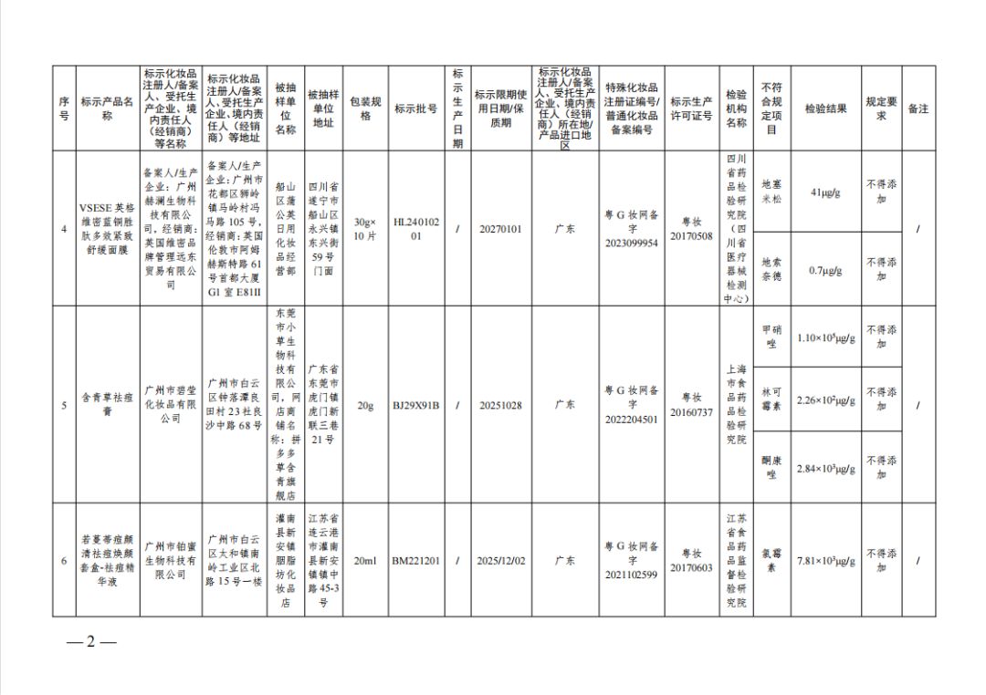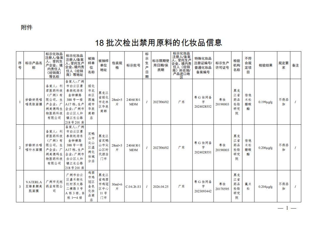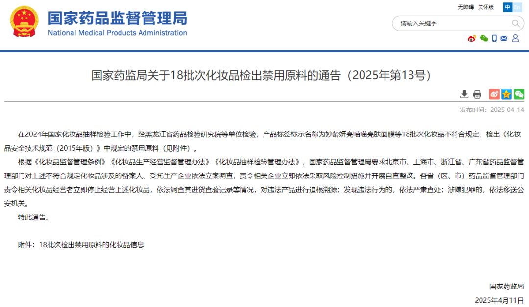 国家药监局4月14日发布通告称,在2024年国家化妆品抽样检验工作中,经黑龙江省药品检验研究院等单位检验,产品标签标示名称为妙龄妍亮喵喵亮肤面膜等18批次化妆品不符合规定(见附件),检出《化妆品安全技术规范(2015年版)》中规定的禁用原料,包括倍他米松醋酸酯、氟米松、地塞米松、甲硝唑等抗生素成分。