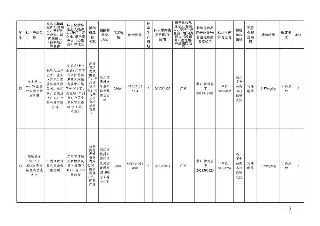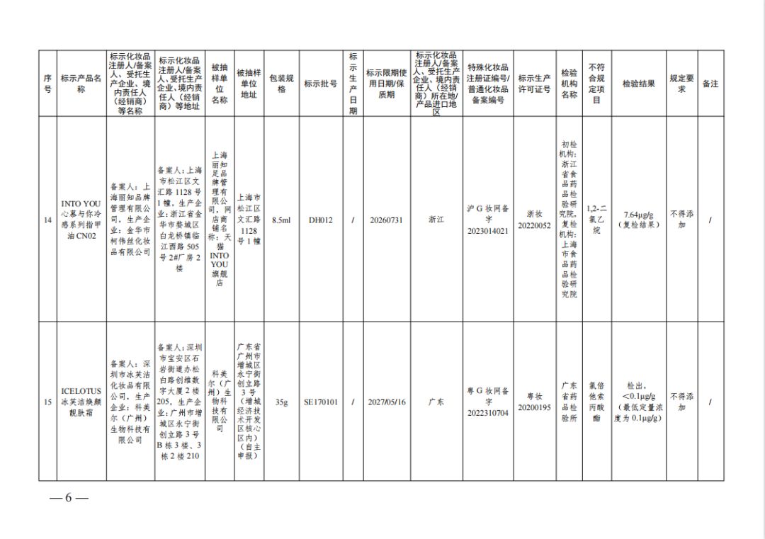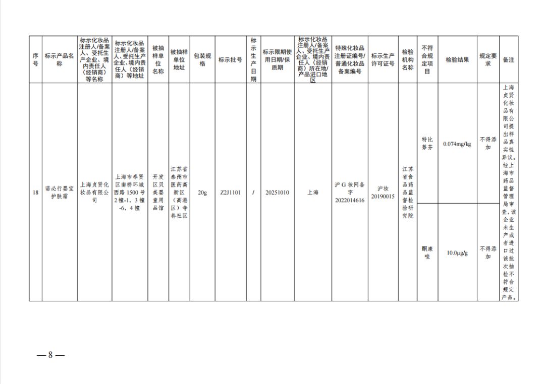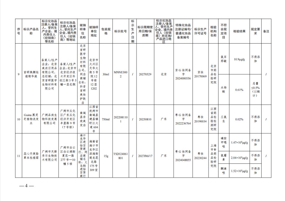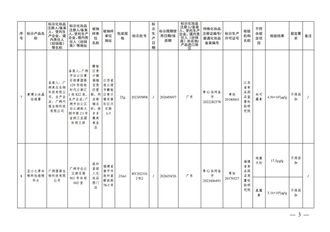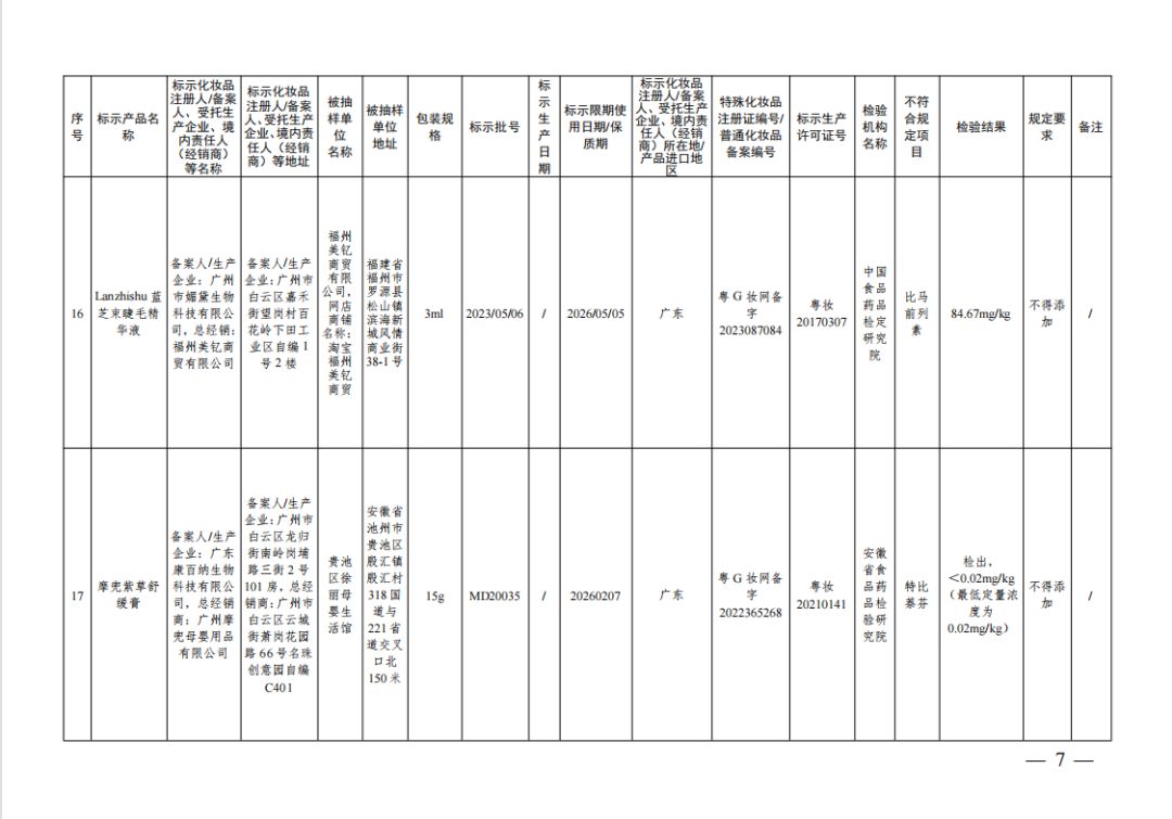 国家药品监督管理局要求北京市、上海市、浙江省、广东省药品监督管理部门对上述不符合规定化妆品涉及的备案人、受托生产企业依法立案调查,责令相关企业立即依法采取风险控制措施并开展自查整改。 各省(区、市)药品监督管理部门责令相关化妆品经营者立即停止经营上述化妆品,依法调查其进货查验记录等情况,对违法产品进行追根溯源;发现违法行为的,依法严肃查处;涉嫌犯罪的,依法移送公安机关。 附件内容如下: