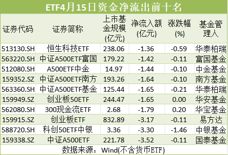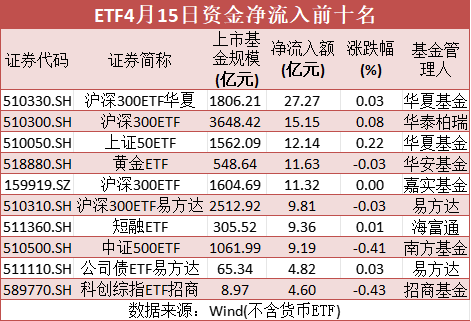 从各类型ETF资金流向上看,宽基ETF与商品ETF净流入居前,分别达61.29亿元与22.89亿元,策略风格ETF净流出居前,流出金额为2.68亿元;规模变化方面,宽基ETF规模增加37.56亿元。 具体到指数维度,跟踪沪深300指数的ETF单日净流入居前,达57.84亿元;跟踪中证A500指数的ETF单日净流出居前,净流出金额为17.02亿元。从最近5个交易日的角度观测,近期资金流入沪深300ETF超62亿元,流入上证50ETF超30亿元。 易方达基金旗下ETF最新规模达到6159亿元,昨日增加13.9亿元。其中,沪深300ETF易方达净流入9.8亿元,科创综指ETF易方达净流入3.6亿元,黄金ETF净流入2.9亿元,科创板50ETF净流入1.1亿元。 华夏基金旗下ETF中,沪深300ETF华夏和上证50ETF单日净流入居前,分别净流入27.27亿元和12.14亿元,最新规模分别达1806.21亿元和1562.09亿元,对应跟踪指数近一月日均成交额分别为18亿元和27.21亿元。科创50ETF和中证1000ETF分别净流入2.66亿元和2.12亿元,游戏ETF净流入1.85亿元,芯片ETF净流入也超1亿元。 多只沪深300ETF持续“吸金” 尾盘放量的多只沪深300ETF毫无悬念地登上ETF资金净流入榜前十名。 Wind数据显示,4月15日,华夏基金旗下沪深300ETF资金净流入达到27.27亿元,位居全市场首位。华泰柏瑞、嘉实、易方达旗下沪深300ETF资金净流入分别达到15.15亿元、11.32亿元、9.81亿元,均跻身当日ETF资金净流入榜前列。