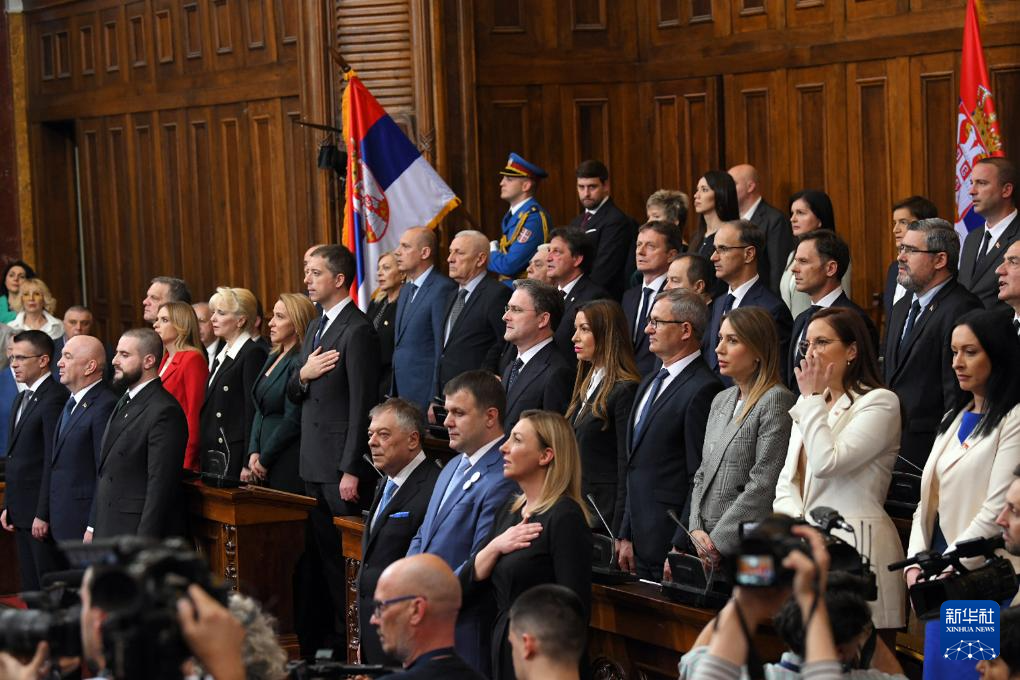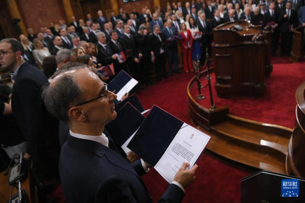 4月16日,塞尔维亚新内阁成员在贝尔格莱德的国民议会宣誓就职。新华社发(普雷德拉格·米洛萨夫列维奇摄) 马楚特15日在国民议会召开的特别会议上介绍其施政纲领时强调对内通过对话恢复稳定、对外独立平衡的政策重点。他呼吁全国团结与和解,强调“塞尔维亚厌倦分裂”。在国际事务上,马楚特表示塞尔维亚将在保持独立性的同时继续加入欧盟的进程,并继续致力于广泛的国际合作。
