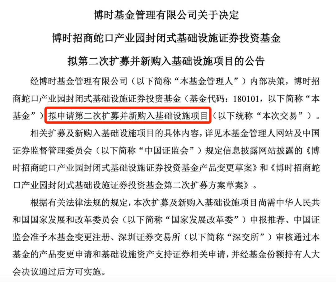 公募REITs扩募迎来又一标志性事件。 4月16日晚间,博时基金发布关于博时招商蛇口产业园封闭式基础设施证券投资基金拟第二次扩募并新购入基础设施项目的公告,这也意味着公募REITs即将迎来首单二次扩募的项目。 早在2023年6月16日,首批公募REITs扩募项目正式在沪深交易所上市,据Wind数据统计,截至今年4月16日,已有4单扩募项目正式上市,实际扩募金额突破50亿元,还有1单正式获批等待发售,其他多个扩募项目持续推进,公募REITs“首发+扩募”双轮驱动的格局进一步深化。 公募REITs迎来首单二次扩募项目 4月16日,博时基金发布《关于决定博时招商蛇口产业园封闭式基础设施证券投资基金拟第二次扩募并新购入基础设施项目的公告》。