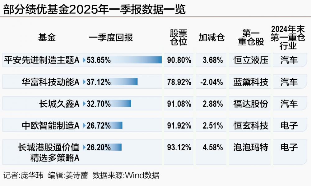 倾向“高仓位+加仓” 首批已披露一季报的67只基金中,有44只主动权益基金(包括灵活配置混合型、偏股混合型、平衡混合型基金、普通股票型,下同)。 其中,有完整仓位数据披露(注:剔除2025年新成立基金与无数据情况)的41只主动权益基金中,有22只仓位在90%以上,18只仓位在80%~90%之间,仅1只基金仓位低于80%,为79%。它们普遍仓位较高。 值得关注的是,41只主动权益基金中,有23只主动权益基金在今年一季度加仓,占比56%;另有18只主动权益基金减仓,占比44%。 其中,相较于2024年四季度末的仓位数据,有6只主动权益基金大举加仓超过5个百分点。包括永赢医药健康A加仓9.23个百分点、朱雀碳中和三年持有加仓8.16个百分点、金信深圳成长A加仓7个百分点、朱雀匠心一年持有加仓6.82个百分点、金信优质成长A加仓5.63个百分点、朱雀产业精选A加仓5.32个百分点。 另有5只主动权益基金加仓4~5个百分点,6只基金加仓1~4个百分点。 简单来说,从首批基金一季报的披露情况来看,一季度主动权益基金普遍是高仓位运作,并以加仓为主,特别是还有部分主动权益基金大举加仓。这说明多数基金经理对后市向好有坚定信心。 谁业绩好? 一季度基金业绩出现明显分化,大部分基金净值上涨。 2025年一季度,代表主动权益基金的“万德偏股混合型基金指数”上涨4.65%。 Wind数据显示,目前市场上有4482只主动权益基金(成立于2025年以前,包括灵活配置混合型、偏股混合型、平衡混合型、普通股票型,仅计算初始基金,下同),其中3423只基金一季度收益为正,占比约76%;另有1059只基金收益小于或等于0,占比约24%。 从主动权益基金一季度收益来看,正负收益比大约为3:1,大约近八成正收益,两成负收益。 不过,一季度基金业绩结构分化严重。 其中,涨幅最好的基金,如闫思倩管理的鹏华碳中和主题A,一季度收益为60.26%,还有一批北交所基金涨幅靠前,比如中信建投北交所精选两年定开A一季度上涨38.98%。 目前已披露一季报的基金中,平安先进制造主题是一季度普通股票型基金冠军,其A类份额一季度收益为53.65%。业绩表现优秀的还有:华富科技动能A,收益为37.12%;长城久鑫A,收益为32.70%;中欧智能制造A,收益为26.72%;长城港股通价值精选多策略A,收益为26.20%。 与之相对,一季度跌幅最大的财通成长优选C,一季度下跌24.58%。此外,重仓美股的QDII基金跌幅靠前,比如华夏全球科技先锋,一季度下跌18.05%。 目前已披露一季报的基金中,也有部分表现欠佳,如永赢医药健康A,一季度收益为-7.79%;永赢新能源智选A,收益为-6.51%;金信消费升级A,收益为-5.53%。 对此,格上基金研究员托合江表示,“今年一季度机器人板块领涨,北交所表现突出,相关重仓基金取得较大的涨幅。而美国科技股自高点下跌,相关QDII基金跟随美股下跌。” 排排网财富研究员卜益力表示,从整体来看,2025年一季度公募基金经理调查结果呈现出两大显著特征。首先,随着市场逐步企稳回升,公募基金经理的投资信心明显增强,多数基金经理选择保持较高仓位运作以把握市场机遇。其次,在资产配置方面,公募基金经理普遍聚焦于科技与成长赛道,特别是AI人工智能、机器人、半导体等具备创新驱动属性的科技成长板块成为重点布局方向。 “新风口”:人形机器人+AI 已披露一季报的基金中,包括一季度普通股票型基金业绩冠军平安先进制造主题基金。平安先进制造主题A,一季度回报为53.65%。 平安先进制造主题基金一季度获得7.72亿份净申购,规模从2024年末的0.48亿元,激增至一季度末的13.21亿元,大增12.73亿元。同时,其股票仓位由2024年末的87.12%,增加至2025年一季度末的90.80%,加仓3.68个百分点。 平安先进制造主题重仓人形机器人赛道,一季度,该基金大幅加仓了恒立液压、浙江荣泰、奥比中光、三花智控。 此外,华曙高科、峰岹科技、龙溪股份、浙海德曼、科达利、四会富仕新晋十大重仓股。 平安先进制造主题基金经理张荫先表示,2025年一季度主要配置维持在人形机器人方向。力求深度参与人形机器人产业的高速成长。 张荫先认为,人形机器人产业的发展轨迹将对标智能手机与电动汽车,而且持续周期会更长,赛道容量也更为庞大。 “人形机器人产业在未来数年乃至十年间,无疑将成为极具成长性的黄金赛道,蕴藏着巨大的发展潜力和投资机遇。”张荫先说。 张荫先表示,更愿意把仓位布局在感知类零部件、新制造工艺、潜在新型电机方案、整机组装代工商、积极拓展机器人业务且估值相对偏低的公司等。 另一只披露年报的绩优基金——华富科技动能基金,情况也类似,该基金一季度取得37.12%的好收益。该基金也同样主要配置在人形机器人板块,其全面布局人形机器人板块,包括本体、执行器、传感器、驱动控制、传动装置、设备、材料等各环节。 该基金一季度大幅加仓蓝黛科技、拓普集团、三花智控、北特科技,此外,隆盛科技、美湖股份、中大力德、中鼎股份、银轮股份、瑞迪智驱新晋十大重仓股。 这并非个别现象。 金信精选成长基金经理孔学兵在一季报中也表示,国产半导体正加速从落后追赶走向突破引领,相关领域的“DeepSeek”时刻或将临近,可能蕴含较为丰富的战略性机遇,值得布局守候。 格上基金研究员托合江接受21世纪经济报道记者采访时也表示,“随着DeepSeek横空出世,人形机器人产业快速发展,人工智能和人形机器人成为今年一季度的投资‘