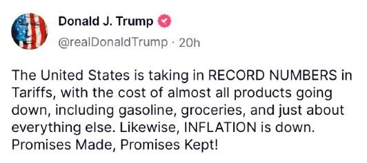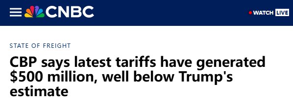 4月16日,特朗普又发帖称自己的关税政策同时给美国带来了“收入历史新高”和“几乎所有商品降价”。但现实数据相当“打脸”,美国海关和边境保护局(CBP)周一在发给媒体的声明中表示,自4月5日新一轮关税开始落地以来,海关累计征收关税5亿多美元。