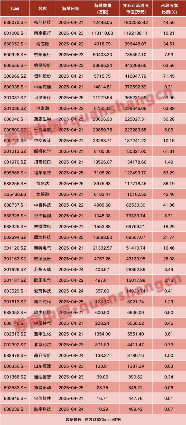 10.本周超842亿元市值限售股解禁 数据显示,本周(4月21日—4月25日)共有37家公司限售股陆续解禁,合计解禁量40.97亿股,按4月18日收盘价计算,解禁市值为842.1亿元。 从解禁市值来看,解禁市值居前三位的是:拓荆科技(190.21亿元)、南京银行(119.22亿元)、纳芯微(99.64亿元)。 从解禁占比来看,解禁占比居前三位的是:恒帅股份(71.45%)、鸿富瀚(63.89%)、德昌股份(63.56%)。 ![]() (文章来源:证券时报网) |