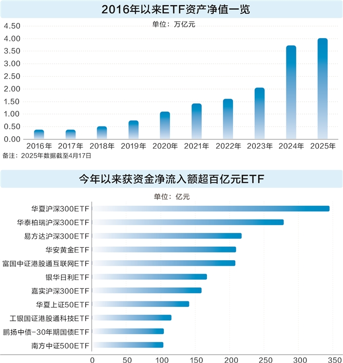 证券时报记者 吴琦 近年来,随着ETF产品不断扩容以及居民资产配置需求不断增加,大量资金流向ETF市场,ETF市场规模屡创新高。ETF市场的蓬勃发展,成为公募基金行业发展的一大增长引擎。 ETF市场规模首次突破4万亿元 截至4月17日,ETF市场规模首次超过4万亿元。数据显示,2020年10月,ETF市场规模迈进万亿元大关。去年9月,ETF市场规模突破3万亿元。 ETF产品数量也已突破1100只,覆盖了股票、债券、商品、货币、跨境等多种类型,为居民资产配置提供了丰富多样的选择。 具体来看,股票ETF占据主导地位,最新规模为2.94万亿元,占比高达73.54%。跨境ETF、债券ETF、货币ETF和商品ETF的规模分别为4970亿元、2392亿元、1738亿元和1466亿元。 单只产品来看,共有6只ETF规模超过千亿元。规模最大的是华泰柏瑞沪深300ETF,规模高达3735.78亿元,其他产品为易方达沪深300ETF、华夏沪深300ETF、嘉实沪深300ETF、华夏上证50ETF和南方中证1000ETF。 博时基金指数与量化投资部总经理兼投资总监赵云阳表示,ETF市场取得显著成绩,有四方面推力:一是政策支持。国家层面出台了一系列政策文件,如近期出台的《促进资本市场指数化投资高质量发展行动方案》,明确了指数化投资的发展方向和支持措施;二是市场需求。随着投资者对被动投资工具认可度提高,ETF等指数化产品的需求不断增加;三是产品创新。市场不断推出新的ETF产品,如中证A500指数和科创200指数的ETF产品;四是市场生态。在交易所、指数编制机构和证券公司等多方协作下,共同提高了投资者对指数化投资的认识和接受度,推动了指数化投资生态的完善。 资金加速净流入 今年以来,ETF市场共获2726亿元资金净流入。其中华夏沪深300ETF获345.08亿元资金净流入,华泰柏瑞沪深300ETF、富国中证港股通互联网ETF、华安黄金ETF、易方达沪深300ETF均获200亿元以上资金净流入。 银华日利ETF、嘉实沪深300ETF、华夏上证50ETF、工银国证港股通科技ETF、鹏扬中债-30年期国债ETF等6只ETF产品均获百亿元资金净流入。 除了A股重要宽基ETF受资金青睐外,港股主题ETF、黄金ETF、货币ETF、债券型ETF都受到资金追捧。 股票ETF被大量买入与“国家队”发力密切相关。截至去年年底,“国家队”持有的ETF规模已突破万亿元。今年4月7日,中央汇金公司、中国诚通和中国国新先后发布公告称增持ETF,并将在未来继续增持。ETF作为中长期资金入市的主要载体,规模有望继续大幅增长。 另外,一些个人投资者配置ETF的种类更加丰富,如债券ETF、商品ETF等。东方证券数据显示,自2015年上半年以来,债券ETF市场的机构投资者持有比例维持在90%以上,但2024年债券ETF的机构投资者持有比例降低至85%附近;商品和货币型ETF中机构投资者占比下降约5个百分点。 仍在继续扩容 今年以来,ETF市场无论是在类型上还是产品数量上,都在继续扩容,一批创新指数ETF、创新主题ETF陆续发行上市。 截至4月18日,今年已有98只ETF成立,合计发行份额为845.76亿份,天弘深证基准做市信用债ETF、博时深证基准做市信用债ETF等债券ETF募集规模均超30亿元,博时科创综指ETF、平安中证A500ETF、建信上证科创板综合ETF和易方达上证科创板综合ETF等股票ETF募集规模均超20亿元。 沪新互挂、自由现金流主题、基准做市债券、科创类等各类ETF先后上市,为投资者资产配置提供更多选择。 自由现金流主题ETF有望成为今年发行最火爆的股票ETF,已有7只ETF募集成立,另有10余只主题ETF处于发行募集阶段。加上已经递交产品申报材料的基金公司,数十家公募基金公司今年将在该领域同场竞技。 今年以来,科创板ETF产品也在加速扩容,新增标的包括科创综指、科创板半导体材料设备等。华安基金表示,科创板投资工具持续扩容的现象表明监管层正通过丰富ETF产品矩阵引导资金精准对接“硬科技”领域,不仅为投资者提供了细分赛道的配置工具,更反映出监管机构对科创板战略性新兴产业的重点扶持。 中新ETF互联互通今年再落一子,招商利安新兴亚洲精选ETF是国内较为稀缺的投资亚洲新兴市场的产品。 (专题数据由证券时报中心数据库提供) |