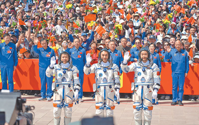 4月24日,神舟二十号载人飞行任务航天员乘组出征仪式在酒泉卫星发射中心问天阁圆梦园广场举行。这是航天员陈冬(右)、陈中瑞(中)、王杰在出征仪式上。 记者陈爽摄