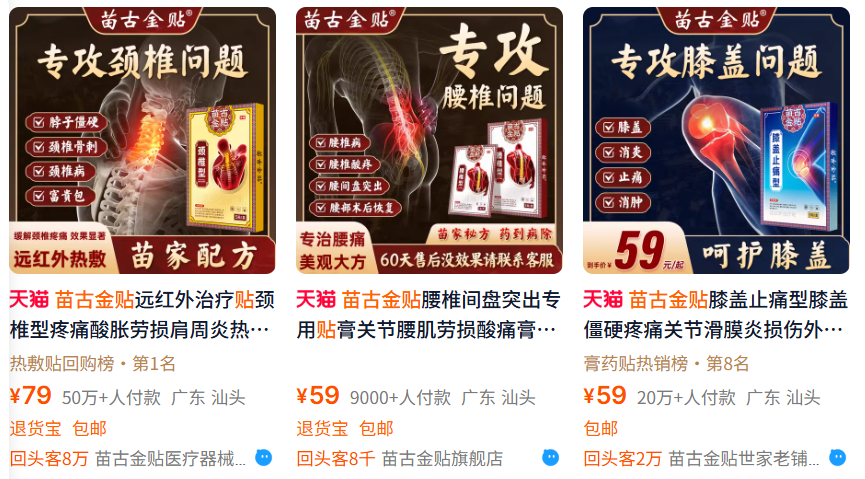 △产品仍在热销 淘宝页面显示付款人数超百万 记者搜索发现,在淘宝、抖音商城、拼多多等平台,苗古金贴产品正在热销。在产品介绍页面上写着“第56代苗古金贴传承人”唐付政,生于贵州苗医世家,早年进入“国医大学”深造……还被中国非遗人才库评定为苗古金贴非遗传承人,形成了特有的苗古金贴治疗方法,享誉四方。