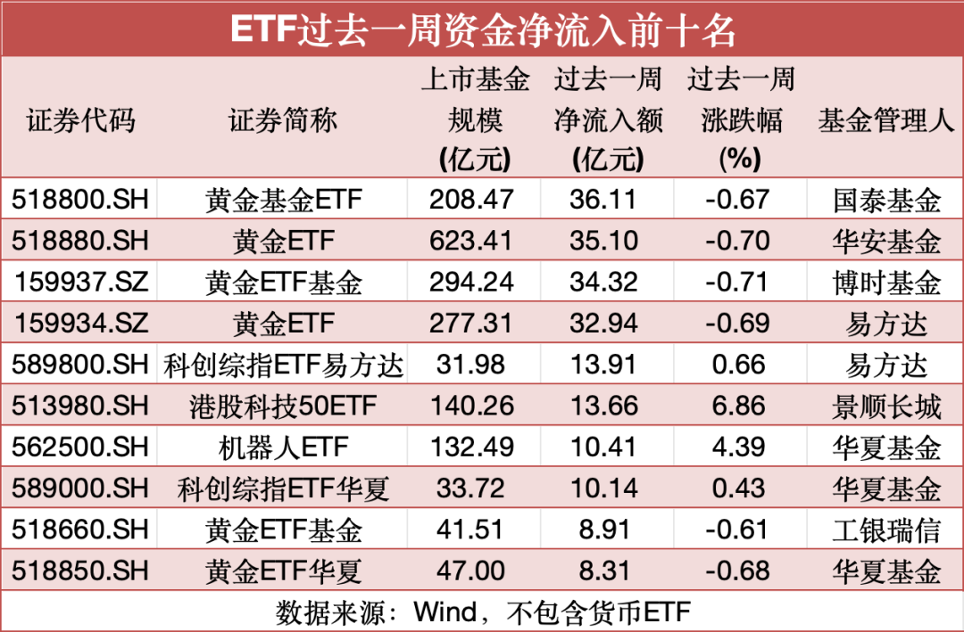 从各大类型ETF上看,上周五,行业主题ETF与全球市场ETF(跨境ETF,不含港股)净流入居前,分别达10.79亿元与1.31亿元,宽基ETF净流出居前,净流出金额为25.06亿元;规模变化方面,全球市场ETF规模上升29.15亿元。 具体到指数维度,跟踪科创综指的ETF单日净流入居前,达8.69亿元,跟踪中证A500指数的ETF单日净流出居前,净流出17.25亿元。从最近5个交易日的角度观测,近期资金流入跟踪SGE黄金9999指数的ETF金额超158亿元,流入跟踪科创综指的ETF金额超26亿元。 尽管市场维持震荡,头部基金公司旗下ETF资金净流入步伐持续。 截至上周五,易方达基金ETF最新规模达到6356.1亿元,单日增加13.9亿元。其中,科创综指ETF易方达净流入4.5亿元,创业板ETF净流入2.2亿元,医药ETF净流入1.7亿元,云计算ETF净流入1.5亿元,科创板50ETF净流入0.3亿元。 华夏基金旗下ETF中,上周五,机器人ETF和科创综指ETF华夏单日净流入居前,分别净流入4.38亿元和2.82亿元,最新规模分别达132.49亿元和33.72亿元,对应跟踪指数近一月日均成交额分别为8.85亿元和0.99亿元。 持续吸金,黄金ETF“霸榜”净流入榜单 最近一段时间,COMEX黄金期货价格“上蹿下跳”,最高触及3509点,之后有所回落,近五日最大回撤接近6.8%。尽管如此,金价波动仍未阻挡资金流入黄金ETF的热情,黄金ETF“霸榜”过去一周ETF全市场资金净流入的前四名。