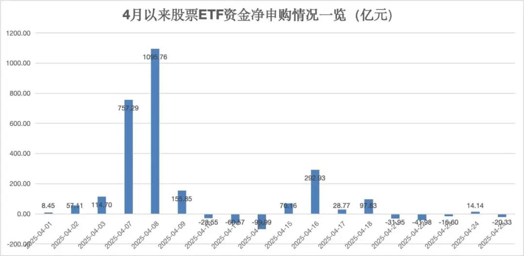 过去一周,上证指数在3200点附近窄幅波动。由于接近五一假期,部分考虑持币过节的资金开始暂时撤离股票ETF。据银河证券基金研究中心统计,股票ETF(含跨境ETF)过去一周资金净流出接近100亿元。 在各大类ETF中,黄金ETF继续成为最“吸金”的品种,过去一周资金净流入前四的ETF被黄金ETF包揽,全市场黄金ETF过去一周资金净流入超180亿元。 股票ETF过去一周资金净流出接近100亿元 上周,上证指数围绕3200点窄幅震荡。从市场风格上看,小盘风格相对占优,中证1000指数上涨1.85%,跑赢沪深300指数1.47个百分点。 从行业表现看,申万一级行业指数涨多跌少,行情轮动较快。涨幅排名前三的行业依次为汽车、美容护理和基础化工,周涨幅分别为4.87%、3.80%和2.71%;下跌最多的三个行业指数为食品饮料、房地产和煤炭,周跌幅分别为1.36%、1.31%、0.63%。 Wind数据显示,截至4月25日,全市场1064只股票ETF(含跨境ETF)总规模达3.3万亿元。按照成交均价计算,4月25日资金净流出20.33亿元,过去一周净流出资金为96.72亿元。