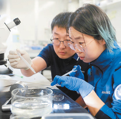 “雪龙2”号科考船上,考察队员迟旭朋(左)和武佳星在船载实验室对南极浮游生物进行分样。 新华社记者黄韬铭摄