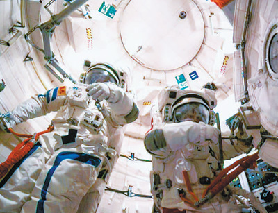 神舟十九号航天员蔡旭哲(右)、宋令东在做出舱准备。 新华社记者李明刚摄