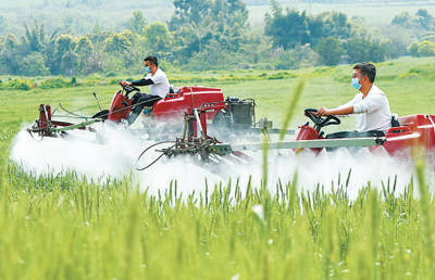 四川成都市双流区黄水镇,95后新农人对小麦进行植保作业。 李向雨摄(新华社发)