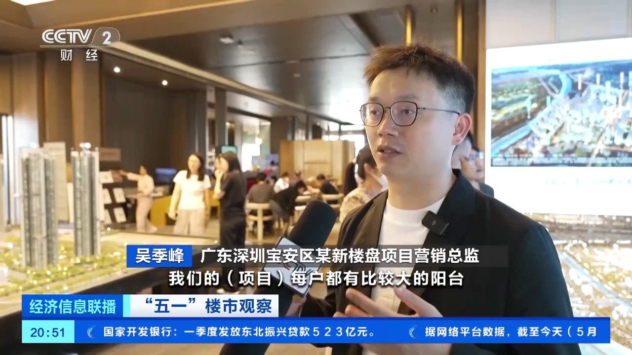 广东深圳宝安区某新楼盘项目营销总监 吴季峰:项目每户都有比较大的阳台,阳台外面有比较好的景观,户内得房率基本上也有90%左右。