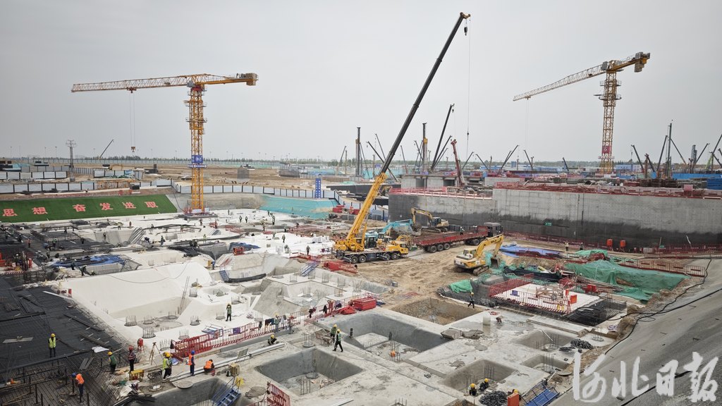 塔吊林立、机器轰鸣,推土机、运输车等往来穿梭……5月4日,雄安新区启动区金融岛核心区域,金融岛站周边一体化开发项目(以下简称“金融岛项目”)建设现场一派火热的施工景象。“五一”假期,1600余名工作人员、125台(套)机械在现场施工,项目进度压茬推进。 金融岛项目总建筑面积超78万平方米,涵盖办公、公寓、商业、交通等功能,将吸引国际知名金融机构入驻。“施工进度最快的一工区B地块已整体进入主体施工的垫层筏板施工阶段。”记者跟随雄商金融岛发展有限公司项目负责人张加健走进B地块施工现场,工作人员正在进行垫层、防水和筏板施工。 来到筏板施工区域,张加健遇到了该工区监理李良斌,两人与项目总包人员一同对筏板作业区进行了钢筋间距检查。 立足承接北京非首都功能疏解,金融岛项目将打造国际金融创新集聚区和雄安开放创新活力区。“1月底,项目总包工程全面开工。今年的目标是12月底首栋塔楼封顶,工程整体冲出正负零。我们计划在2026年底实现项目外立面全部完工。”张加健说。