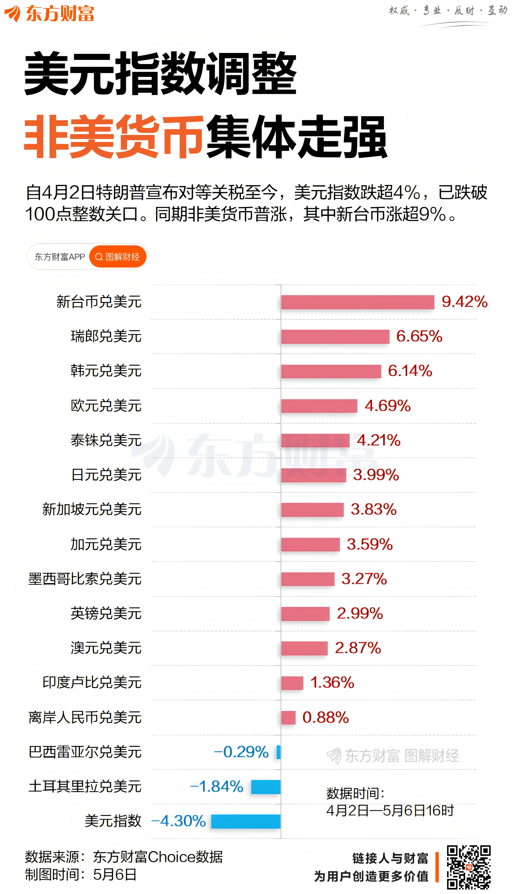 ![]() 美元继续弱势震荡。截至5月6日16时(下同),美元指数报99.61点,已连续三日处于100点整数位心理关口下方。自4月2日美国总统特朗普宣布对贸易伙伴征收“对等关税”以来,美元指数累计跌幅达4.30%。 美元“跌倒”,非美货币随之普涨。自4月2日以来,非美货币普遍上涨,瑞郎、韩元涨超6%,欧元、泰铢涨超4%,新台币涨幅最大,达9.42%。值得一提的是,5月5日,新台币盘中一度飙升近6%,创下三十多年来最大盘中涨幅,升至近三年来最强水平。 机构认为,近日新台币的异常大涨除了美元的贬值外,或应归咎于台湾出口商抛售美元以及台湾大型寿险公司对其所持美元债务进行对冲所引发。台湾寿险业在过去十年中规模大幅扩张,并将大量资产投入美国债券,但为了维持收益率,仅部分对冲其不断膨胀的外汇风险敞口,实际上是将其偿付能力押注在新台币对美元保持弱势上。随着台币飙升,台湾寿险公司正在仓促削减或对冲其美元敞口。 摩根大通在其最新报告中表示,美元的疲软并非源自某种协调性协议,而是由基本面等诸多变化推动的。另外,亚洲强势货币还归咎于多年贸易盈余累积的巨额美元资产开始回流。并警告称在地缘政治、宏观政策与市场预期交织影响下,一场看不见的“货币风暴”或许正在形成。